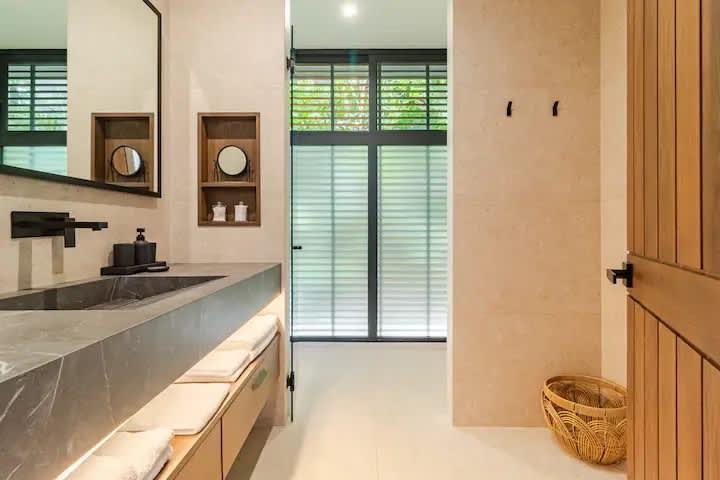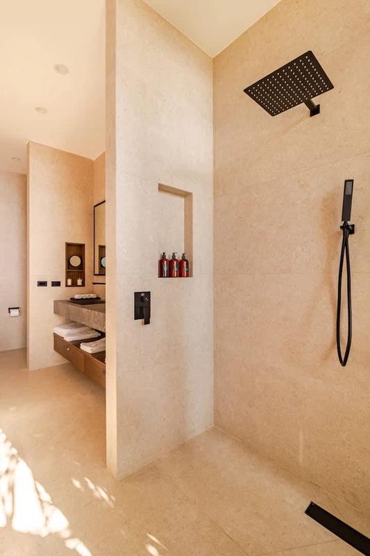 The property features 4 main bedrooms, each with a king-size bed, en-suite bathroom, private entrance, and breathtaking sea views. It also includes an elegant master suite with a private bathroom, and a separate service room on the ground floor with a queen bed and its own bathroom. Every space has been thoughtfully designed with marble, hand-carved wood, and premium linens and towels.