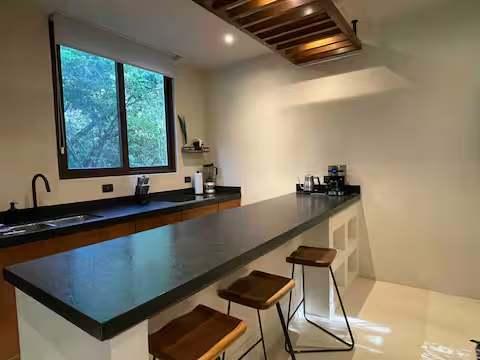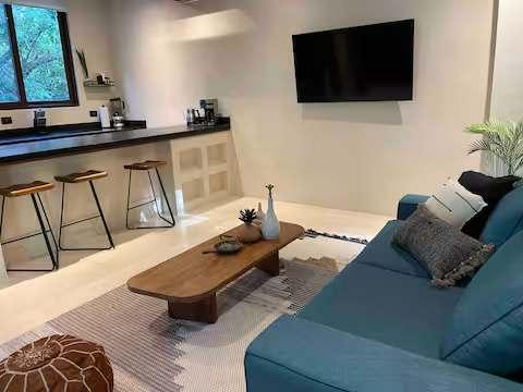 The space features one bedroom with an en-suite bathroom and closet, as well as a spacious living room and a fully equipped kitchen where you can prepare your favorite meals. It also includes a laundry area for your convenience. The highlight is the large terrace—perfect for meditating, exercising, or simply relaxing in the outdoor jacuzzi.