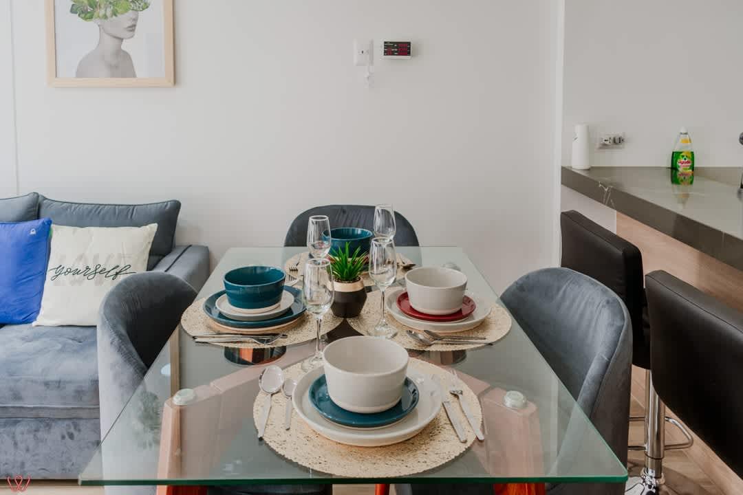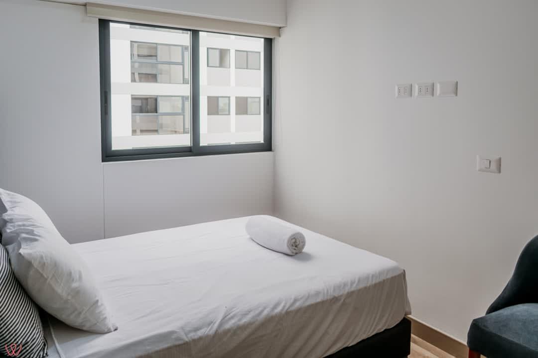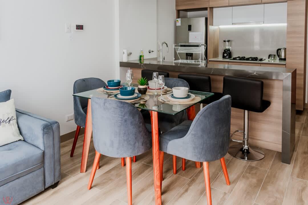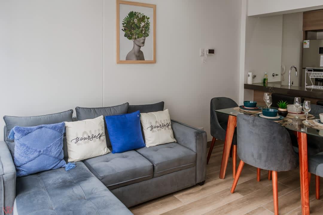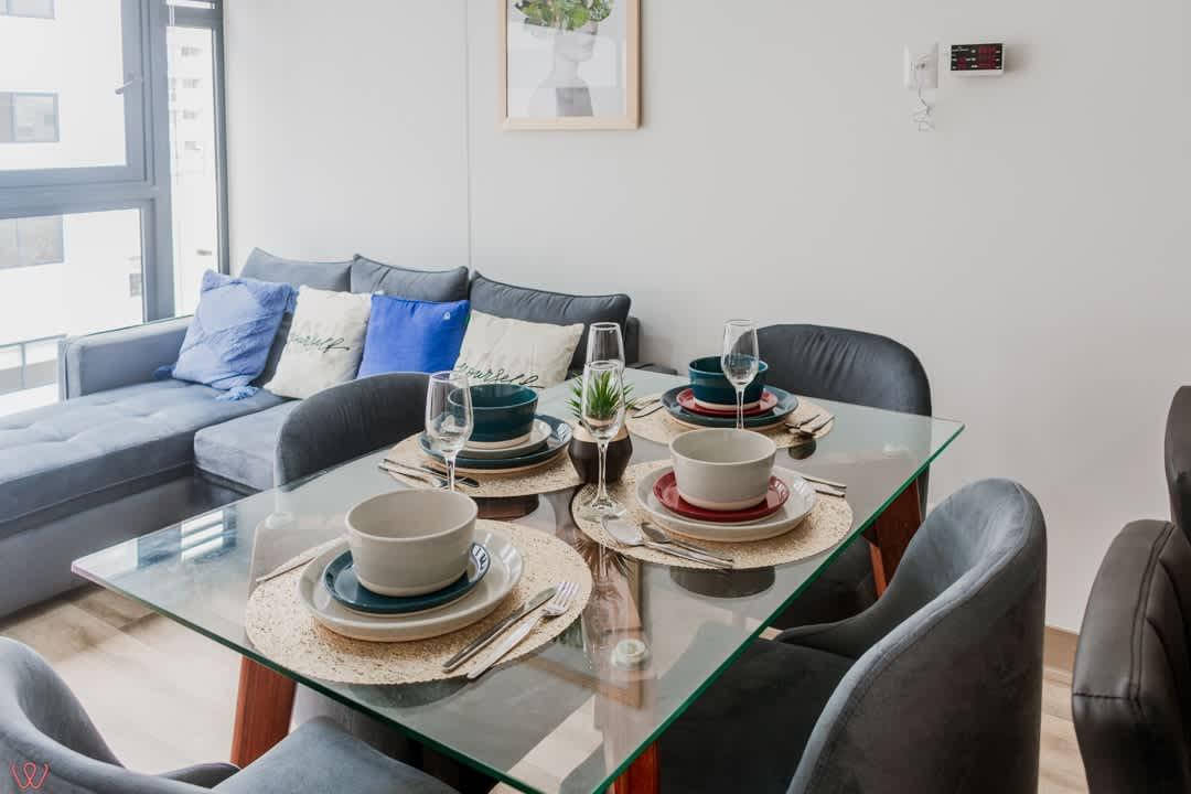 Modern and cozy apartment in the heart of Miraflores, ideal for 4 guests. It has 2 bedrooms, 2 full bathrooms, a fully equipped kitchen, bed linens and towels, parking, and common areas. Located in a safe and quiet area, perfect for vacation or business. You'll feel right at home, and we'll make your stay unforgettable! Welcome!
