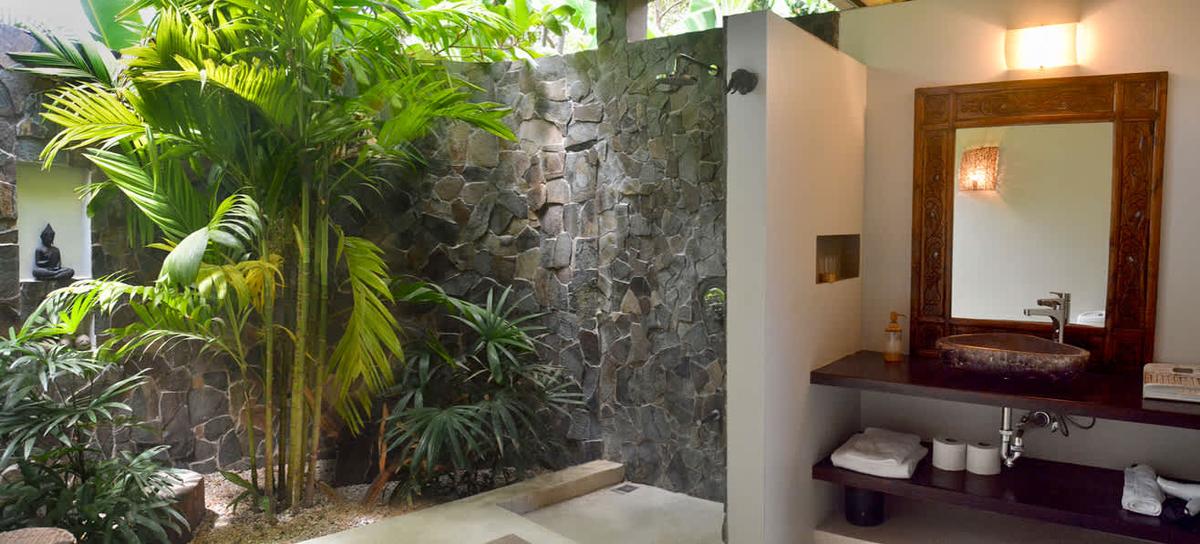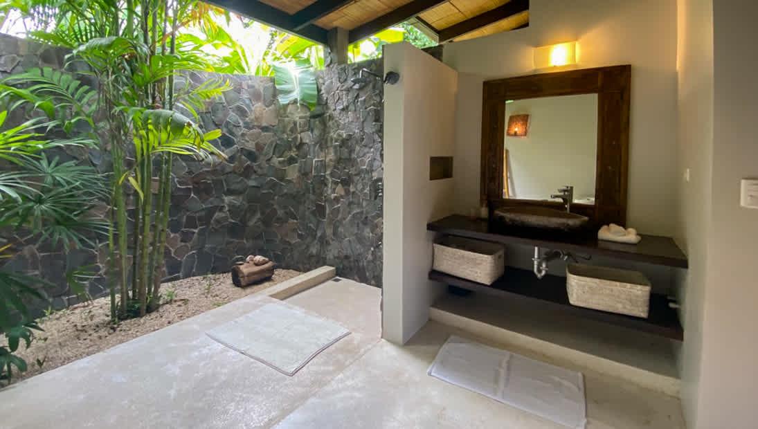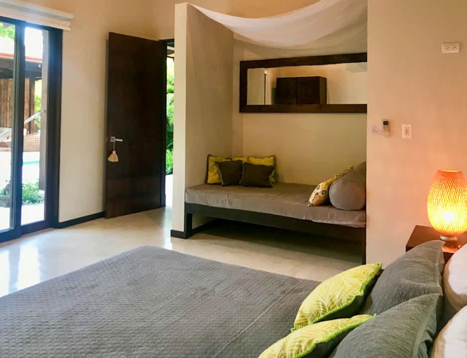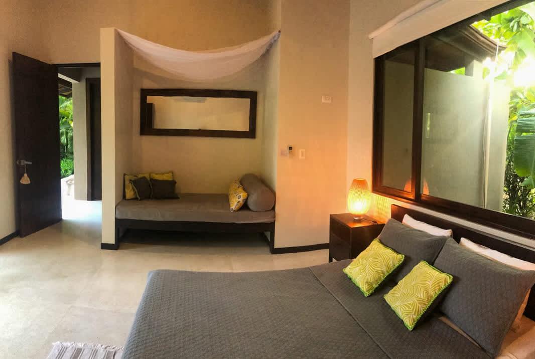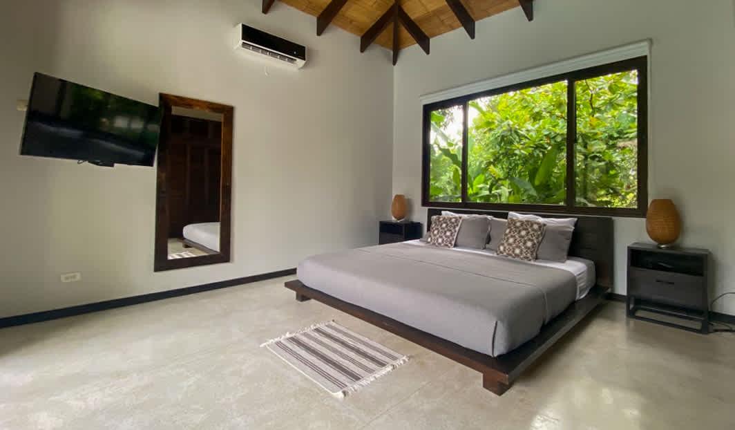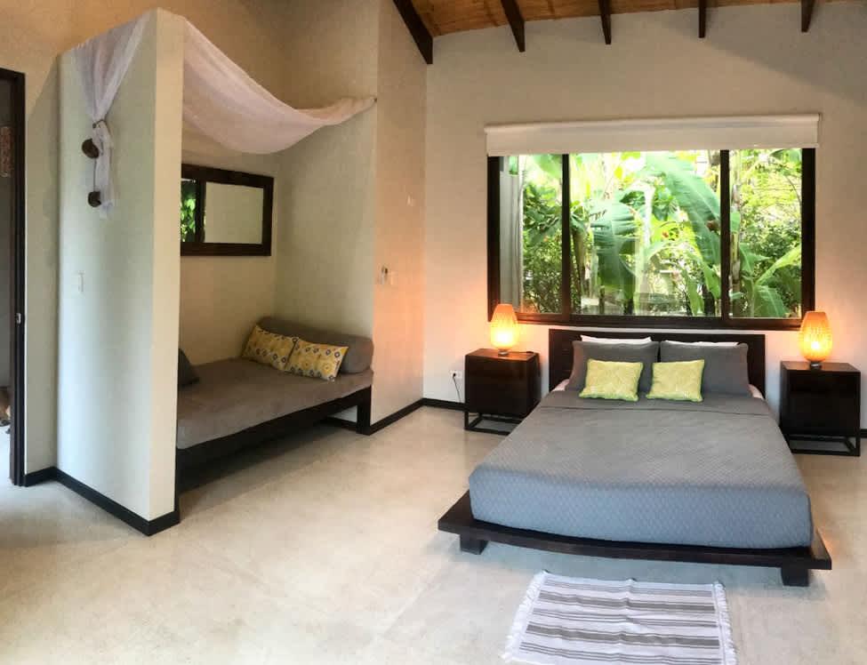 This villa is crafted to awaken the senses. Walk along its open hallway between the infinity pool and a landscape filled with greenery, as the warm Pacific breeze flows through the spaces. Inside, you’ll find two thoughtfully arranged bedrooms: one with a king-size bed, and another with a queen bed plus a cozy sofa bed—ideal for families or small groups of friends. The main bathroom is spacious and includes an outdoor garden that deepens your bond with the natural surroundings.