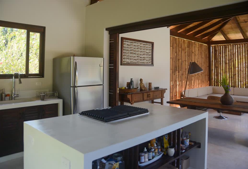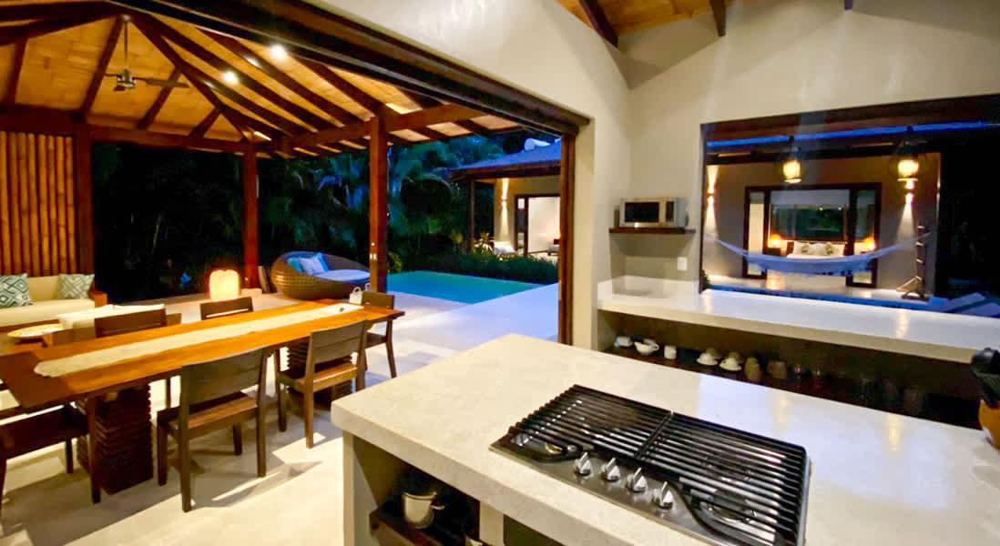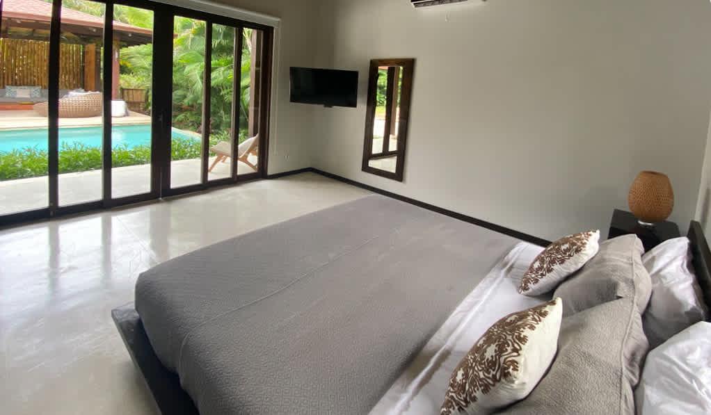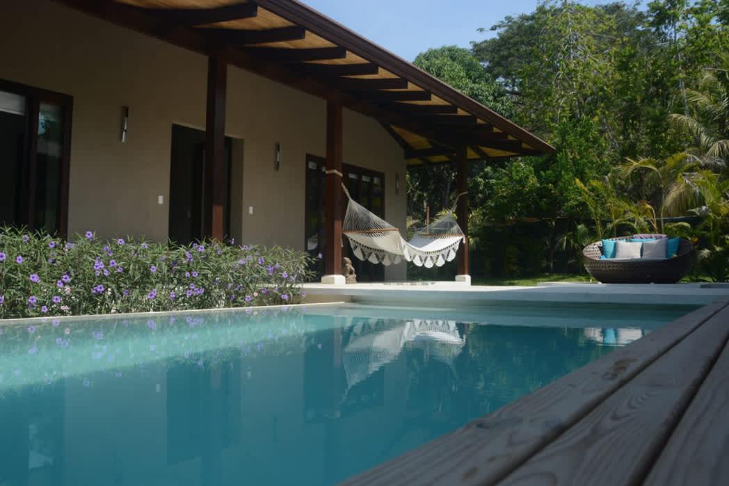 The kitchen is fully equipped, allowing you to prepare your favorite meals and enjoy them in the open dining area or on the terrace, surrounded by tropical sounds. The modern and inviting living room is perfect for relaxation, while the wooden deck with sun loungers and private garden complete this haven of tranquility. Just a two-minute walk along a jungle path takes you to Playa Hermosa—a renowned beach ideal for surfing or simply unwinding by the sea.