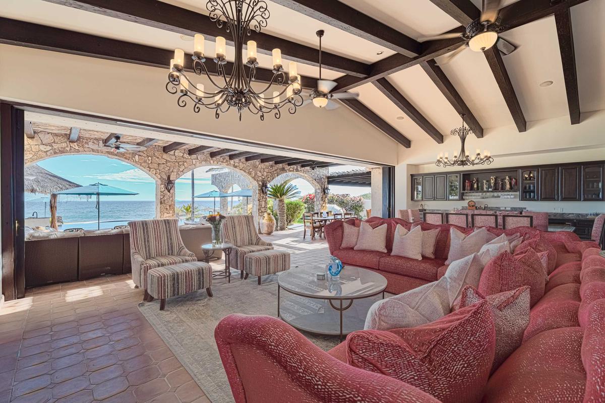 Amenities include a large palapa with a summer kitchen, heated pool with 10 loungers, jacuzzi, BBQ grill, gas fire pit, bar with panoramic terrace, and a covered dining area by the pool. Book your stay and immerse yourself in the luxury and magic of Los Cabos for an unforgettable escape.