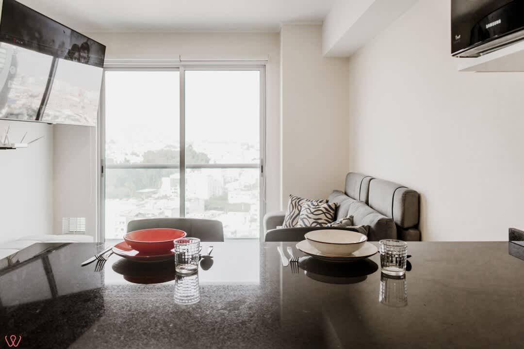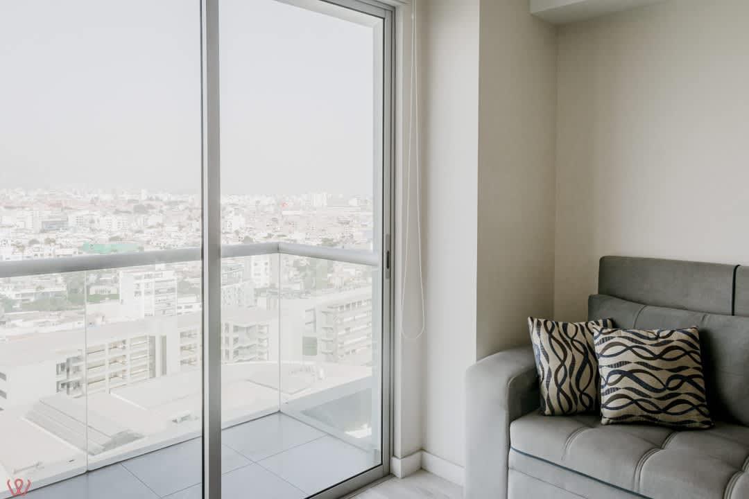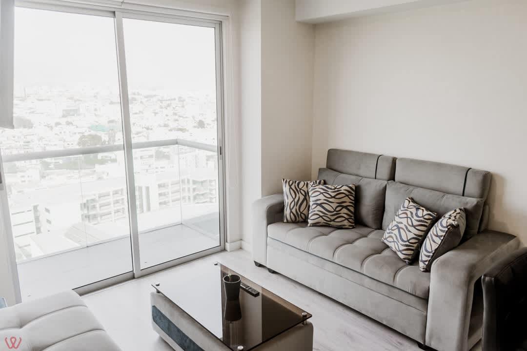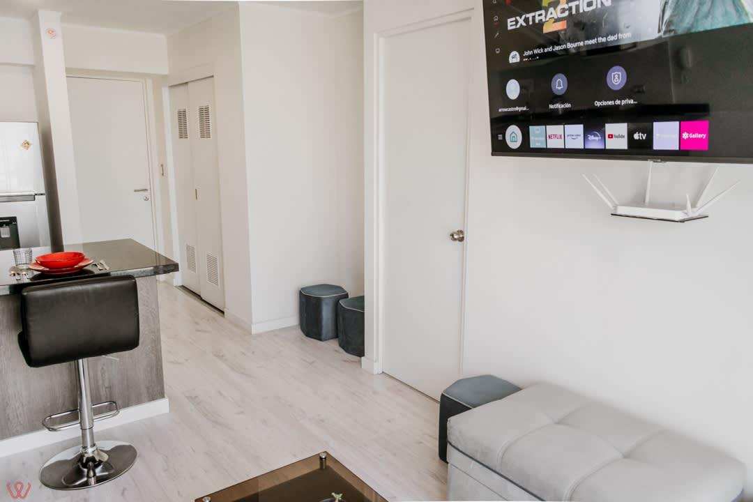 Contemporary and stylish apartment in Surquillo, ideal for couples or solo travelers. Features a bright bedroom with a queen bed, a full bathroom, high-speed Wi-Fi, and a fully equipped kitchen. Located on the 21st floor of a secure building with elevator access and an amazing panoramic view. Minutes from Miraflores, San Isidro, shops, restaurants, and public transport. Great for business trips, vacations, or extended stays.