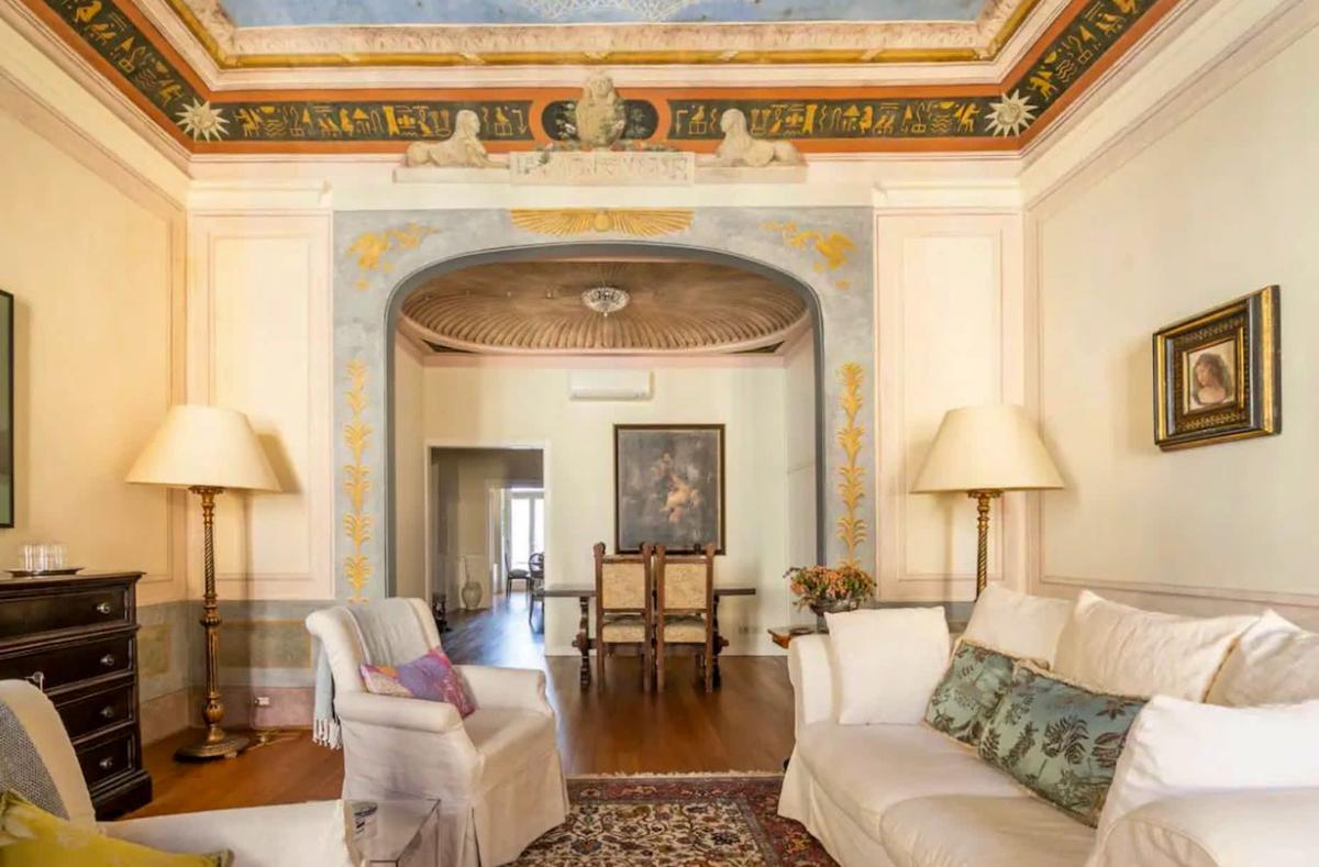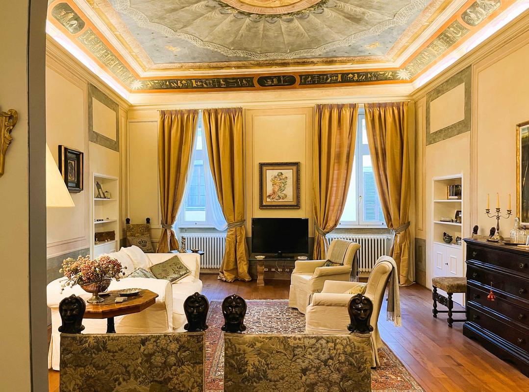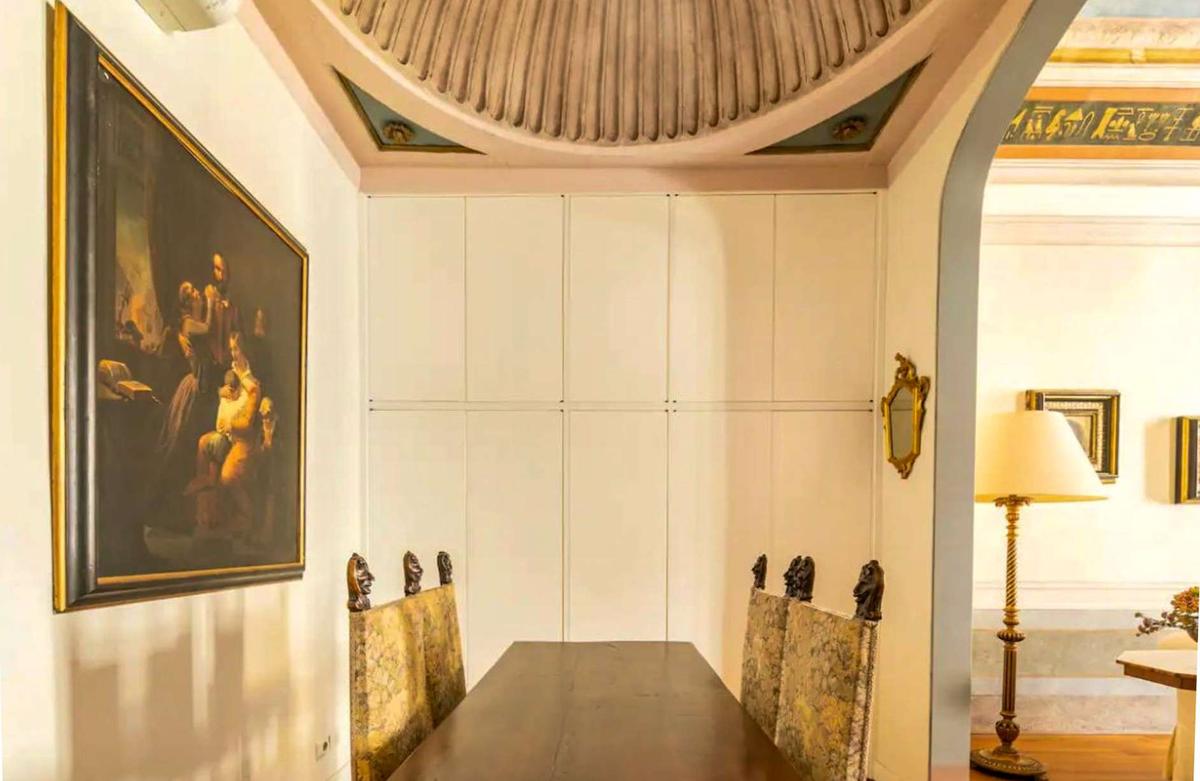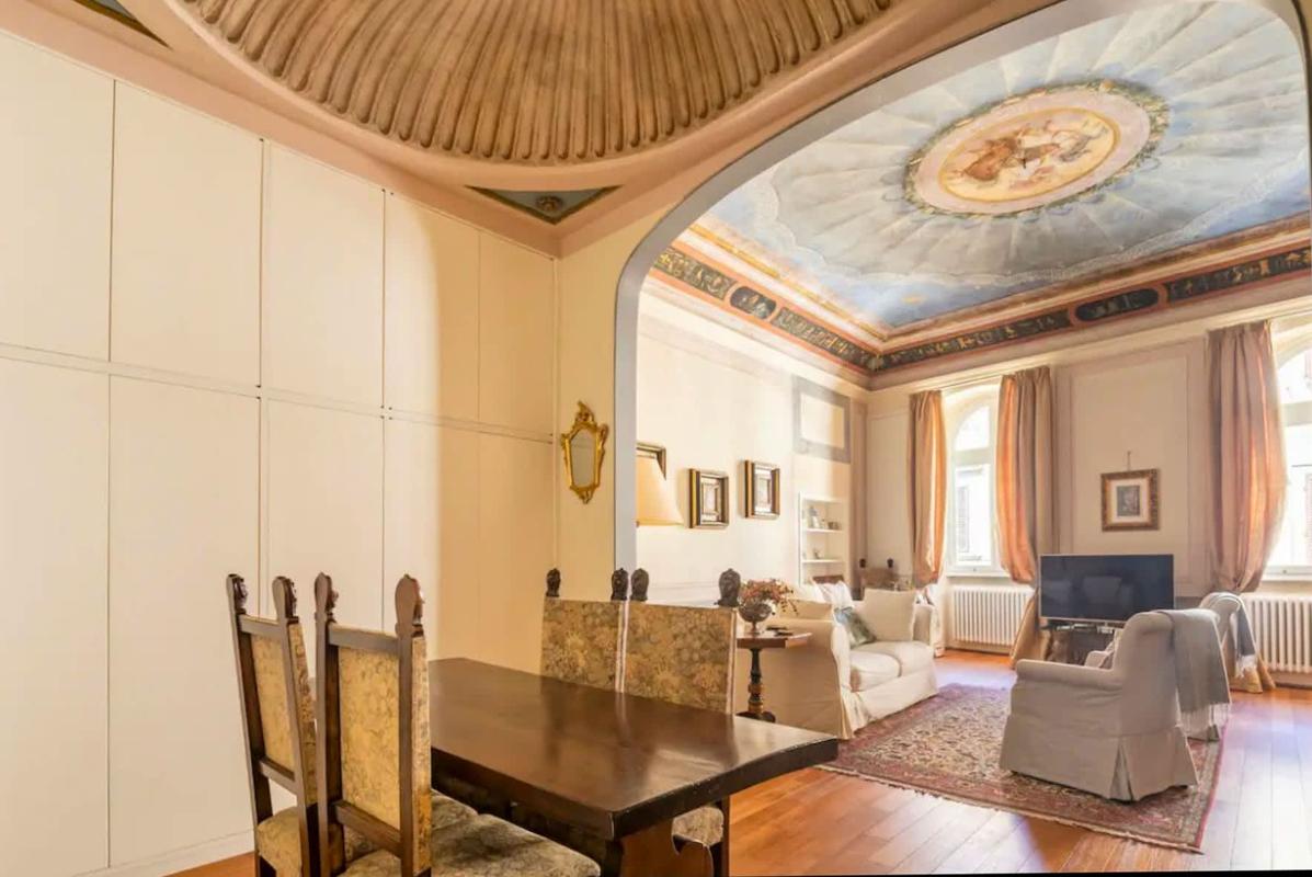 This exclusive one-bedroom apartment, located within an authentic Renaissance palace, perfectly blends the charm of history with the comfort of modern living. Upon entering, you’ll be welcomed by a majestic living room with a beautifully painted ceiling—a true work of art that makes your stay truly memorable.