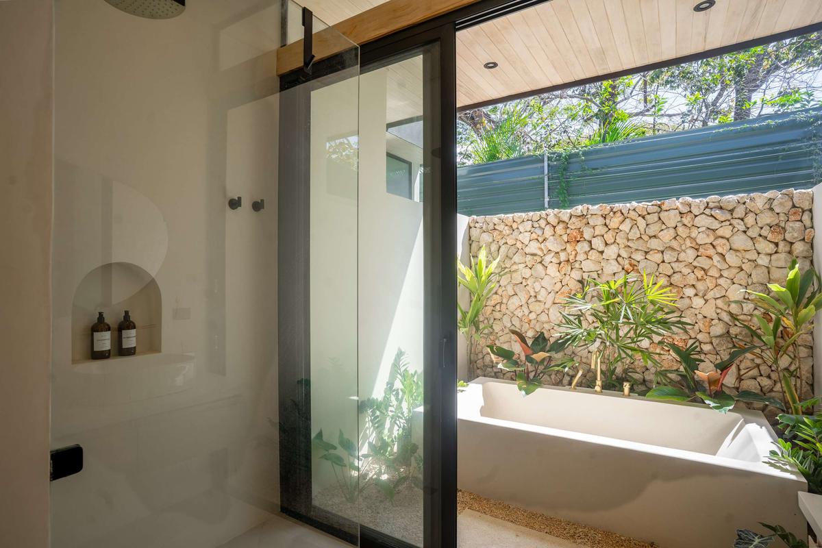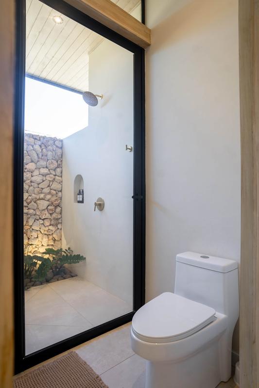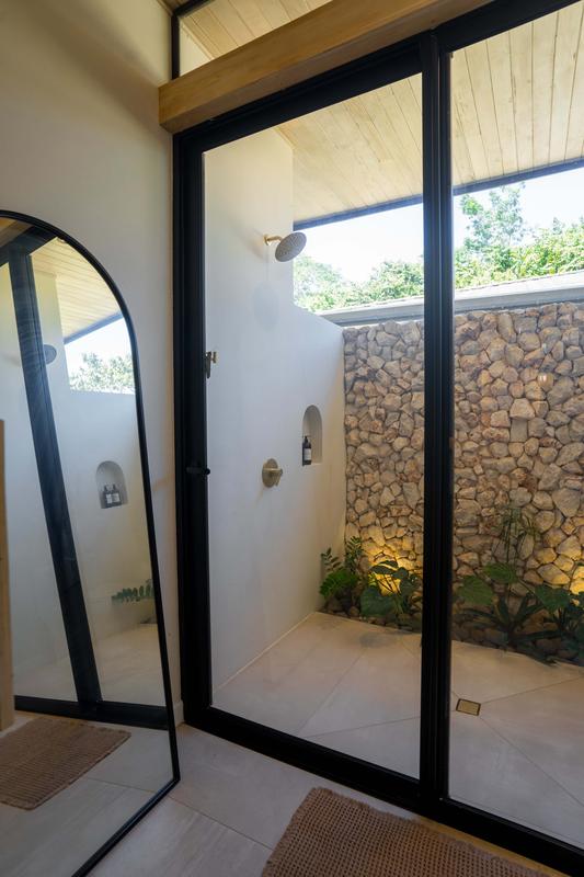 One of its most special corners is the master bathroom, which houses a spectacular outdoor tub, surrounded by vegetation and with a direct view of the sky, perfect for relaxing under the stars or enjoying a warm bath surrounded by nature.