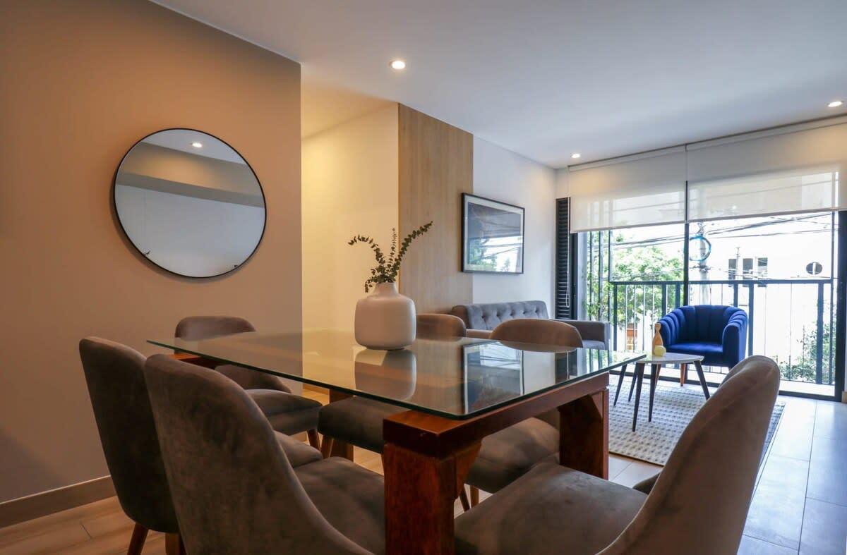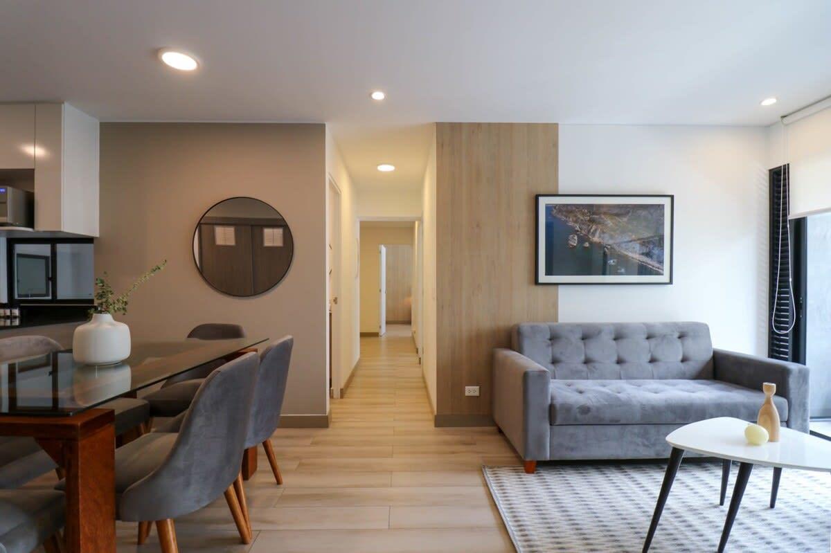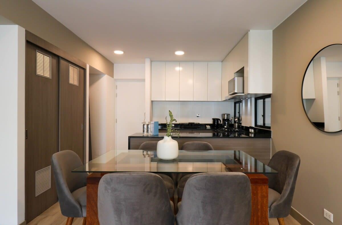 In the welcoming Miraflores neighborhood, this beautiful apartment it's very well located; just minutes away from Larcomar shopping center, Parque Kennedy, Virgen de Fatima Parish, and exclusive gyms. The area has currency exchange services, and labs centers in case you need to take a test, such as ROE and Multilab.