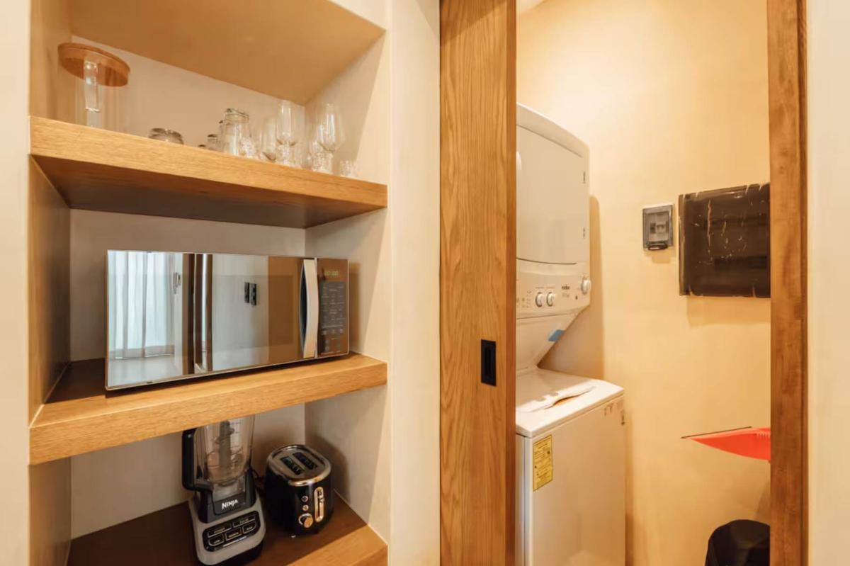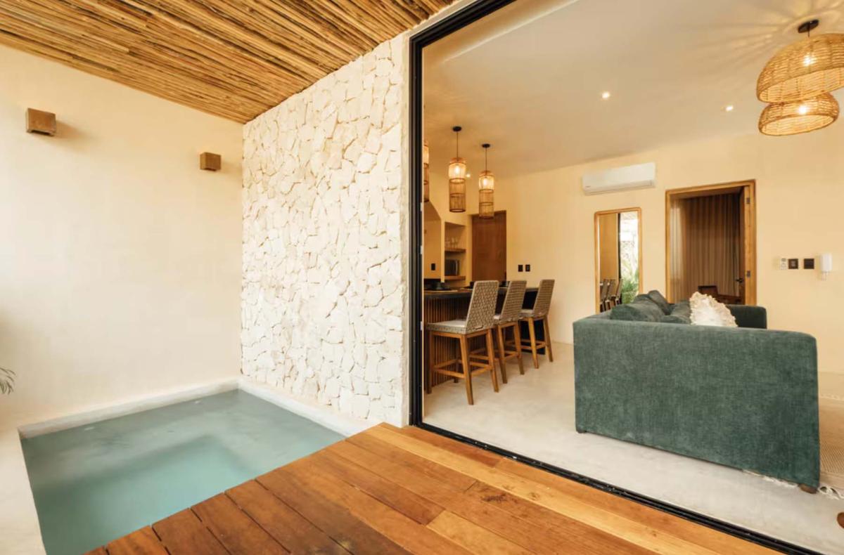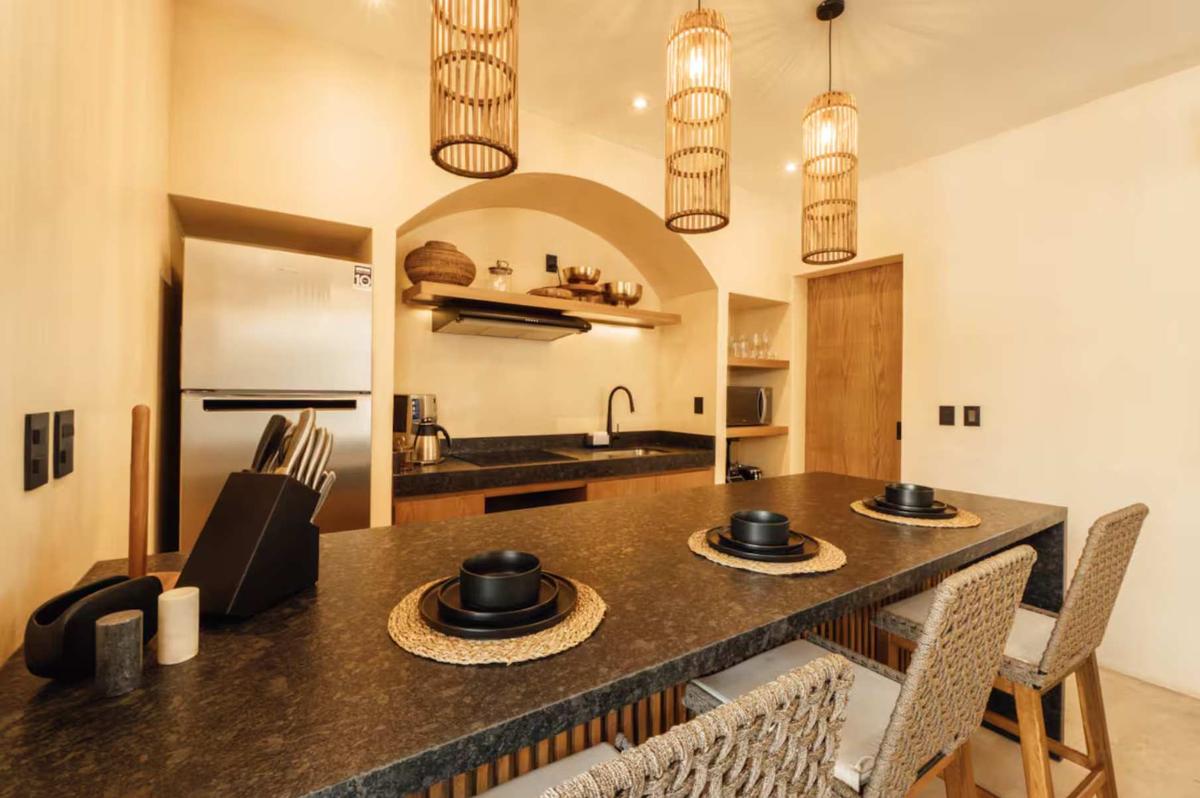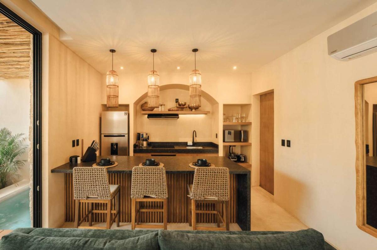 Warmth and bold charm merge in this space. Its terracotta tones and a vibrant green daybed energize the environment, while the master bedroom offers a comfortable king-size bed. Enjoy your private pool surrounded by the lush Tulum jungle, ideal for relaxing after a day at the beach. The fully equipped kitchen, premium appliances, a digital nomad desk, and a washer and dryer ensure a comfortable and practical stay for up to 4 guests.