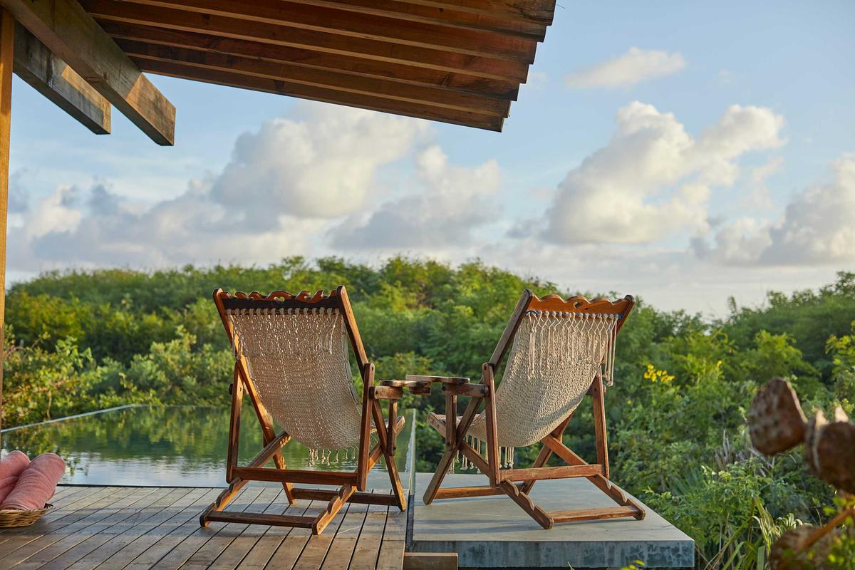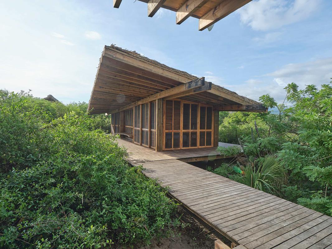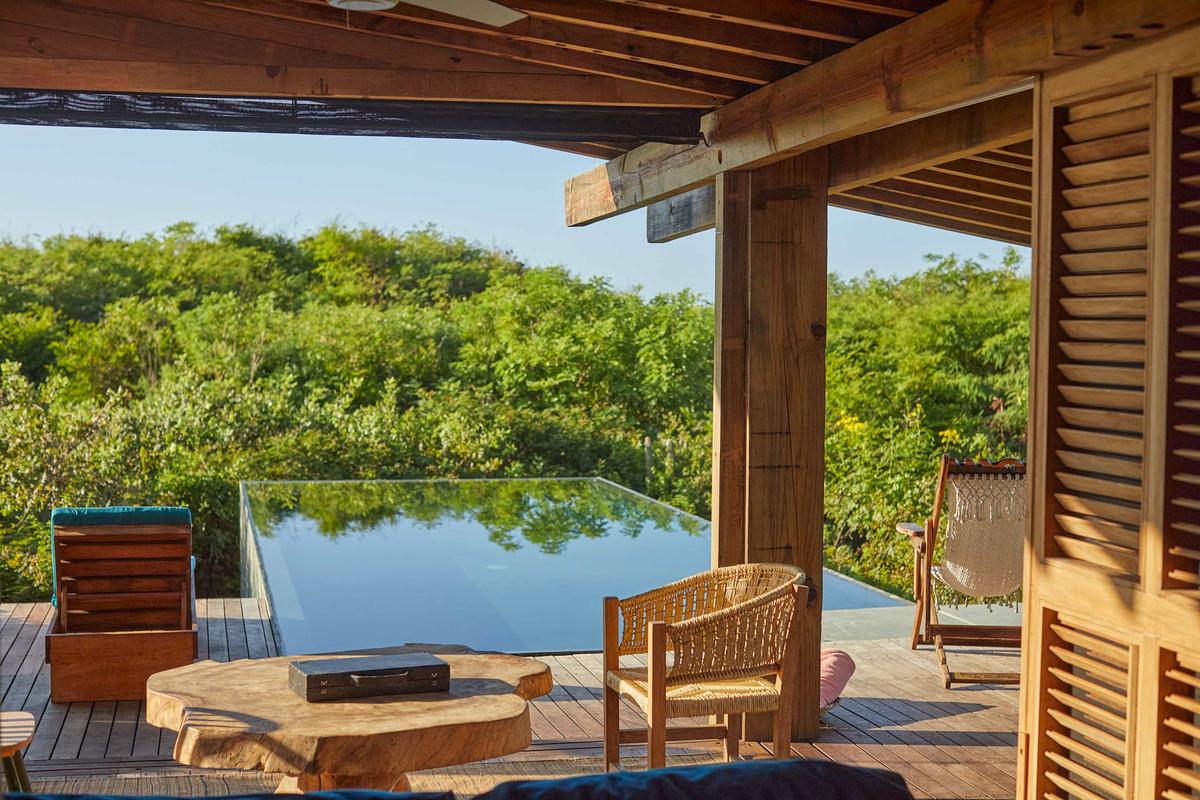 This spectacular villa, located in the heart of the jungle, features a beautiful private pool and spaces designed for relaxation. Thoughtfully designed with attention to detail, it combines vintage furniture with exclusive decor. Its elevated structure respects the surrounding vegetation and offers unparalleled views of the natural environment. The villa is actually two villas connected by a hallway. It is equipped with a kitchenette, three full bathrooms, a living room, dining room, three bedrooms with king-size beds, and a fully furnished terrace, providing everything you need for an unforgettable experience. Additionally, it is just a short distance from the complex's impressive Olympic-sized pool. The complex also offers a variety of amenities, such as the La Palapa restaurant, where you can enjoy breakfast, lunch, and dinner. It also features a fully equipped yoga pavilion, three stunning pools, beachfront pergolas, and trails perfect for exploring the beach and pathways surrounded by lush vegetation.
