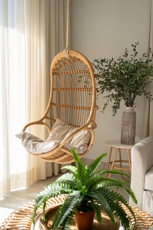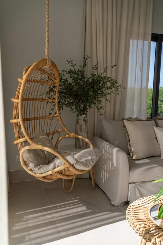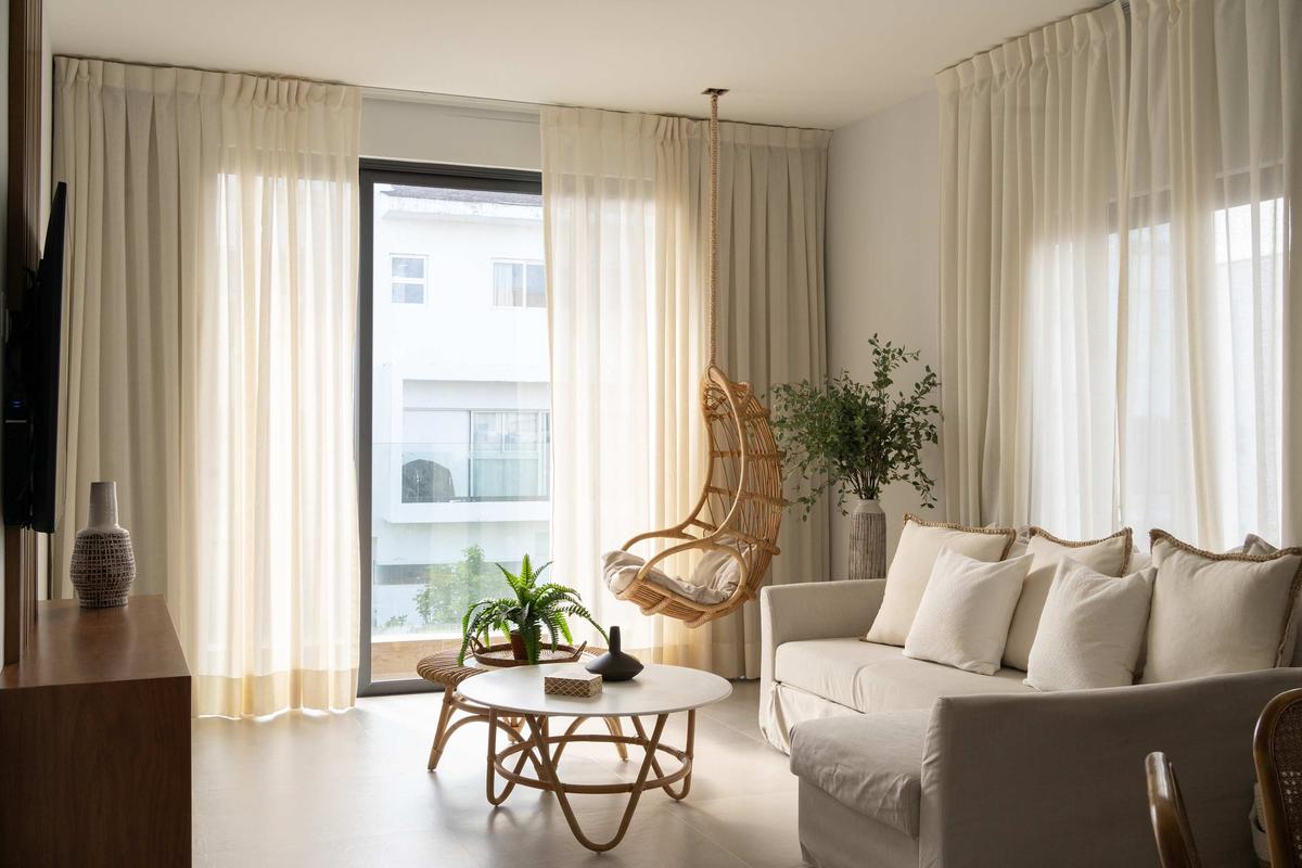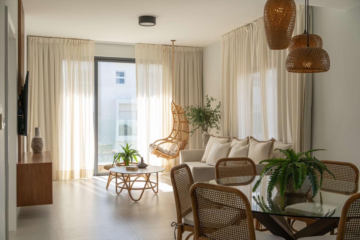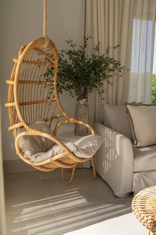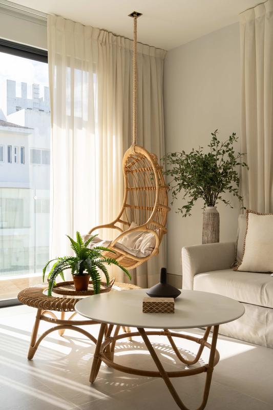 This luxurious apartment offers an elegant and modern experience, perfect for those seeking comfort and exclusivity. The bright and spacious living room features a sofa that converts into a bed, a hanging chair, and large windows that flood the space with natural light.