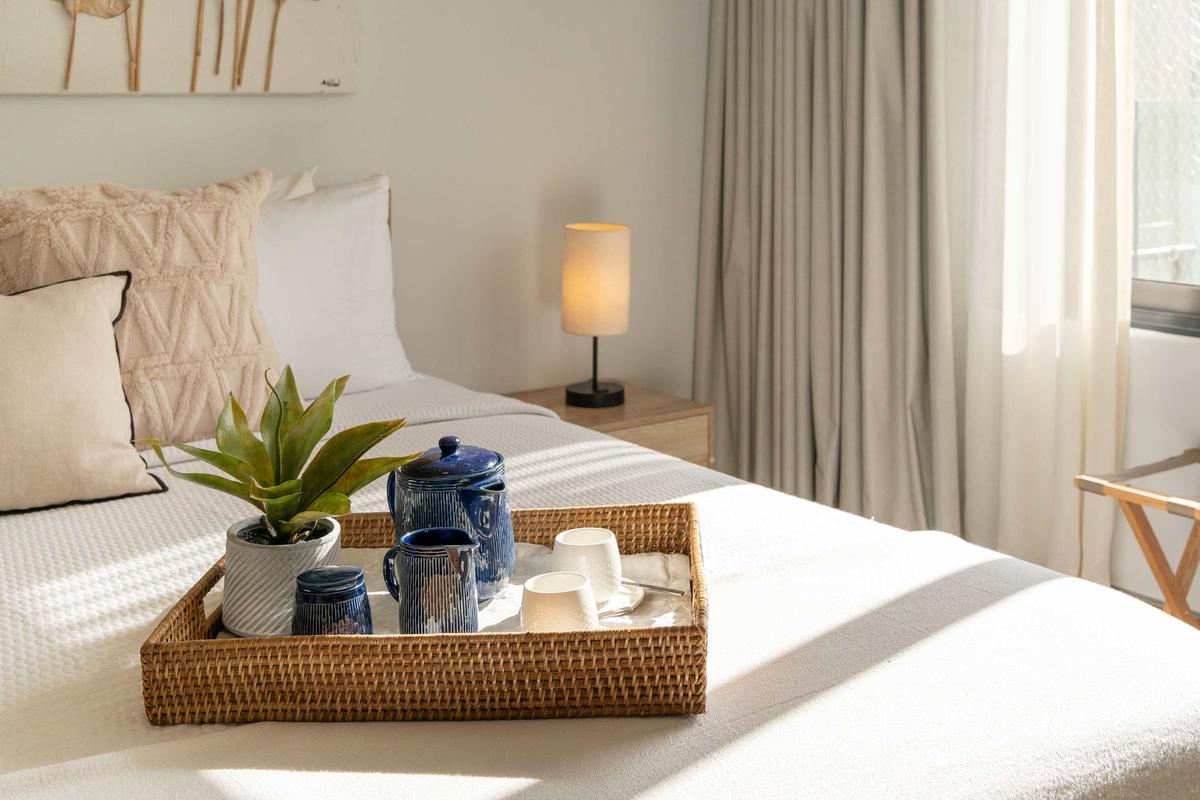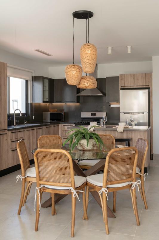 The bedroom, designed as a serene retreat, includes a King-size bed, a Smart TV, and a speaker for your entertainment. The kitchen is fully equipped with modern appliances and complemented by a spacious dining area to enjoy your meals.
