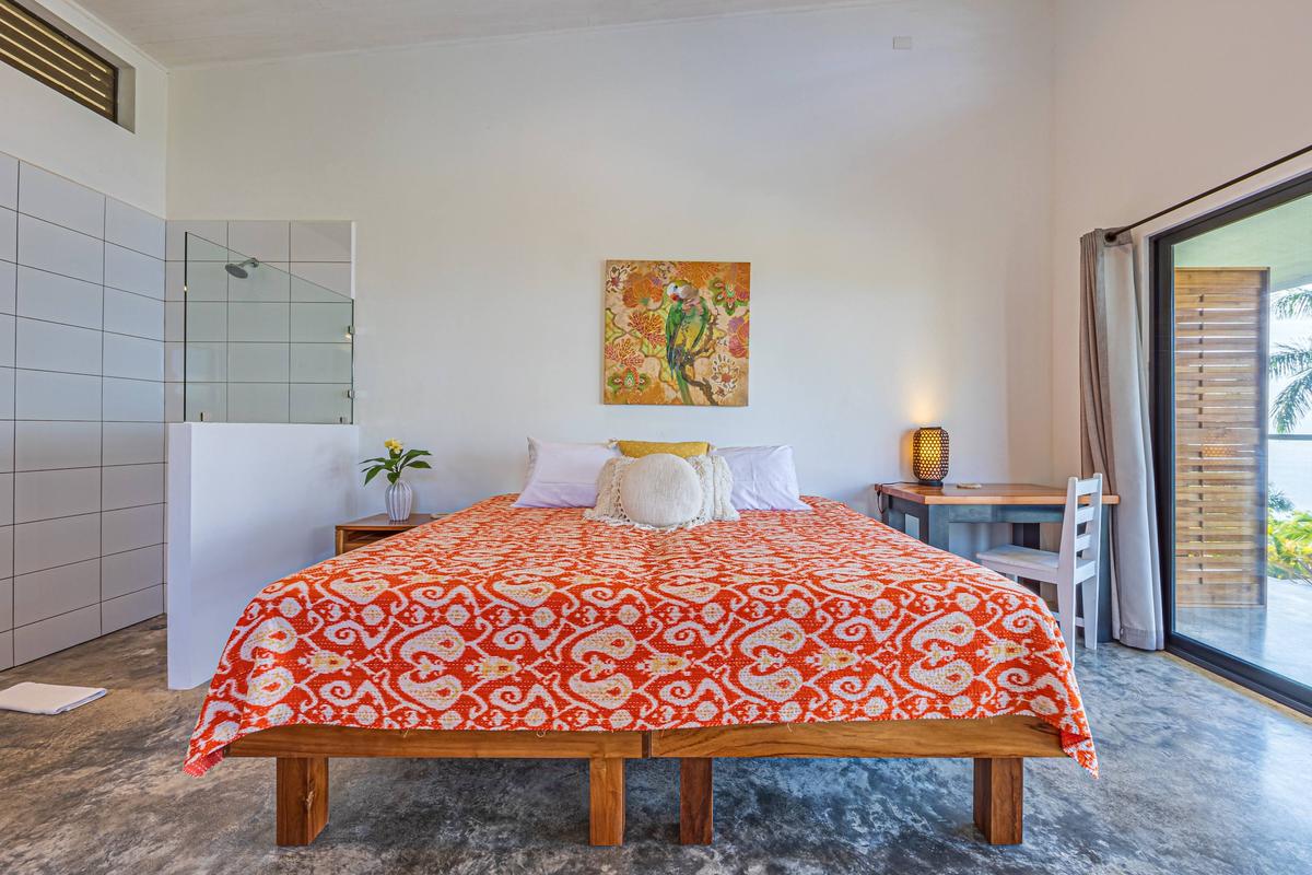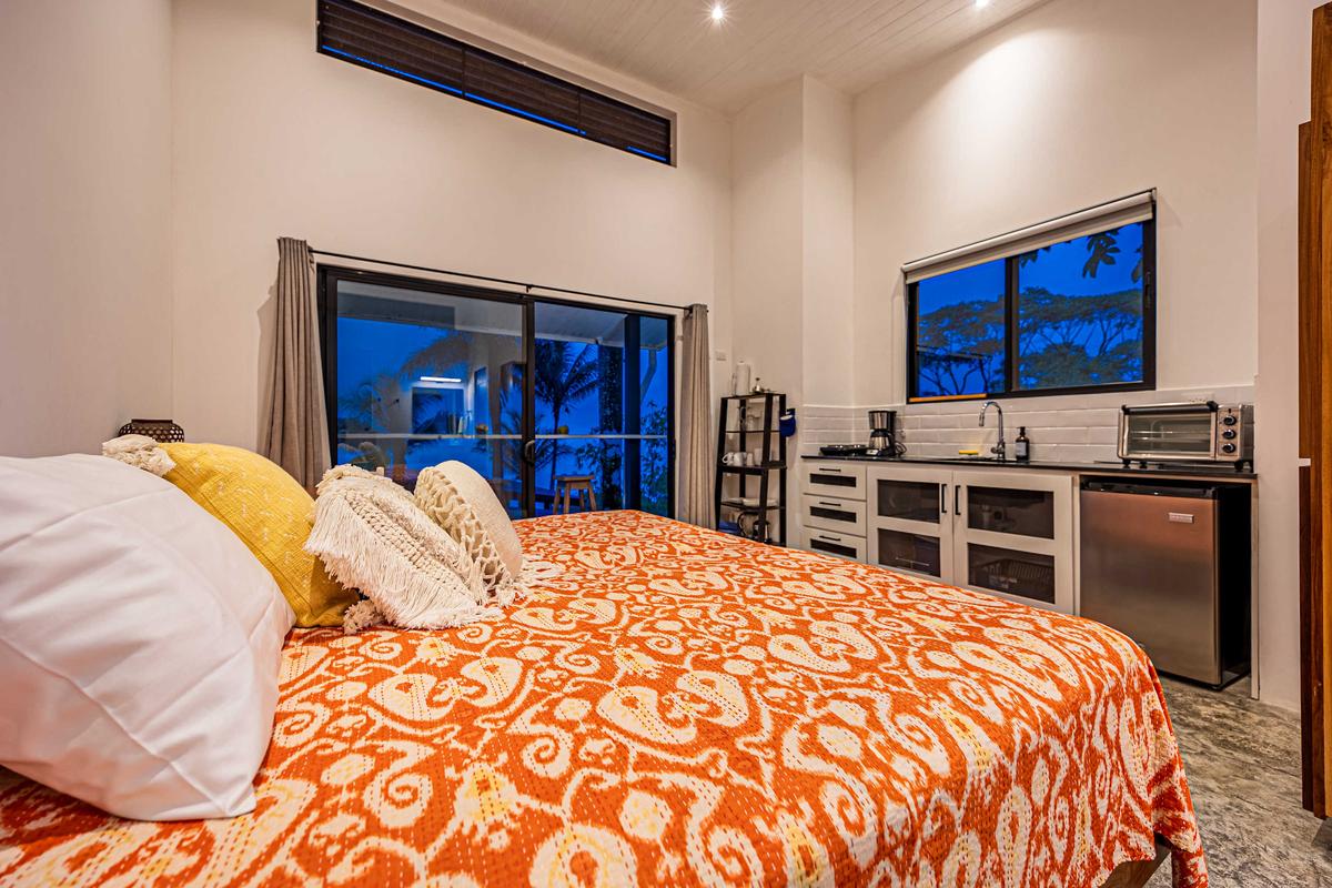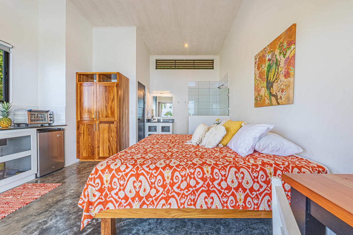 This mid-sized studio has been thoughtfully designed and offers panoramic views of the Pacific Ocean. A unique retreat nestled between Uvita and Dominical, it features a beautiful handcrafted teak bed with hotel-quality mattresses and Egyptian cotton sheets. The king bed can be configured as two XL twin beds upon request, making it ideal for couples, friends, or solo travelers. The studio includes a fully equipped kitchenette with an oven, microwave, refrigerator, coffee maker, electric kettle, blender, toaster, dishwasher, and all necessary cooking and serving utensils: plates, cutlery, wine glasses, pots, pans, oil, salt, and pepper. It also comes with air conditioning, ceiling fan, iron, hair dryer, and a private terrace with an outdoor dining space where you can enjoy ocean views. One of the highlights is access to a spectacular shared pool surrounded by nature, used only by three other villas—ensuring privacy and tranquility. You can also relax on the sun loungers, cool off in the outdoor shower, or enjoy the fire pit under the stars. The property is fully fenced and secure, and a 4x4 vehicle is required to reach it. Access is via self check-in, with support available from the property management team. Each unit has parking for one vehicle, pets are not allowed, and the minimum rental age is 25. The Wi-Fi connection is excellent, perfect for remote work or staying connected while enjoying this natural paradise. IMPORTANT INFORMATION: Cancellation Policy: Cancellations made more than 45 days before arrival are fully refundable. After that period, no refunds will be issued. Check-in: From 3:00 p.m. | Check-out: Before 10:00 a.m. A 4x4 vehicle is required to access the property. Minimum rental age: 25 years old.