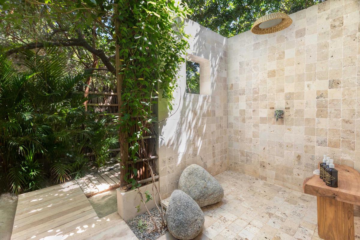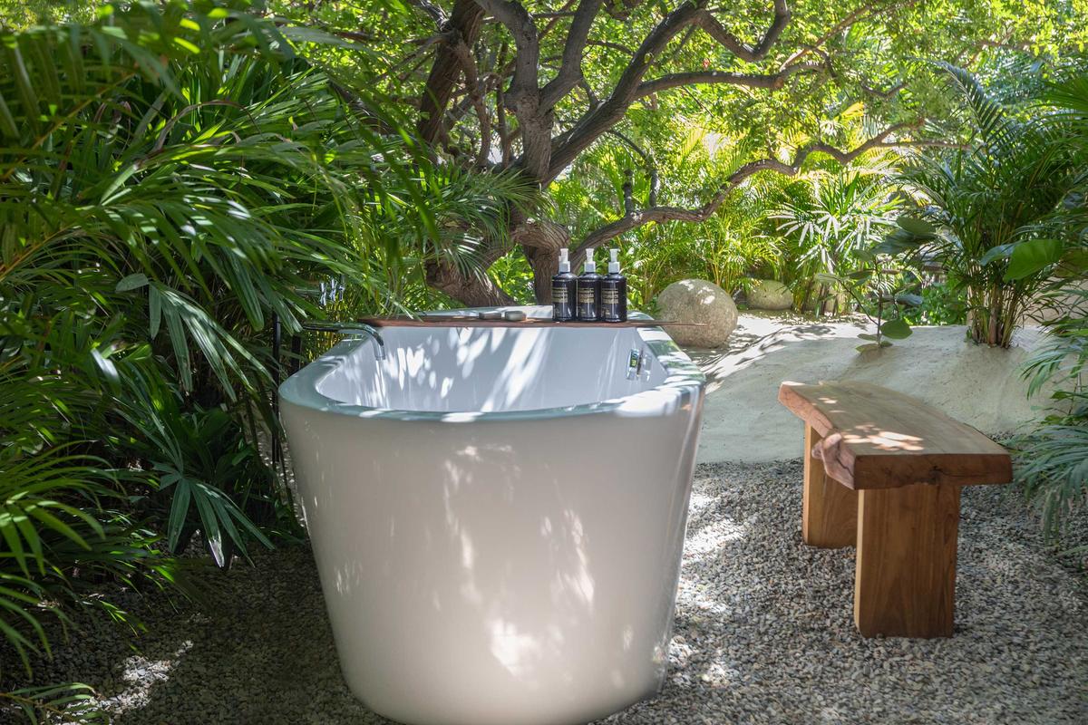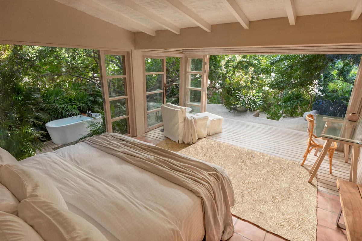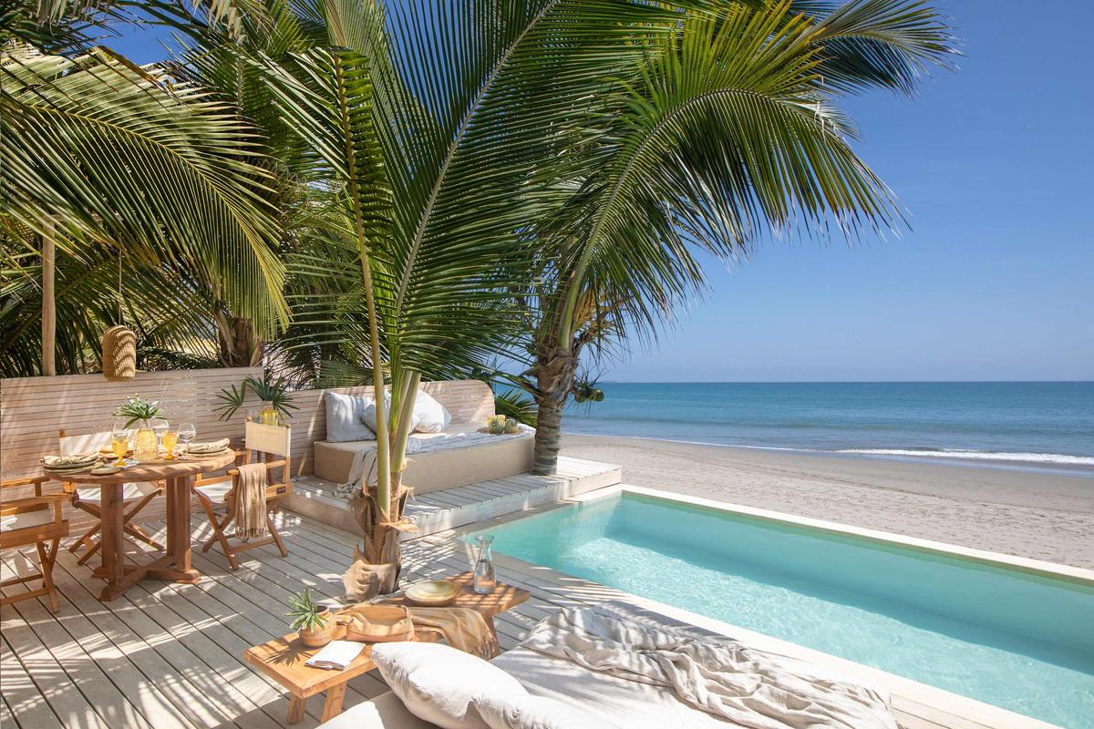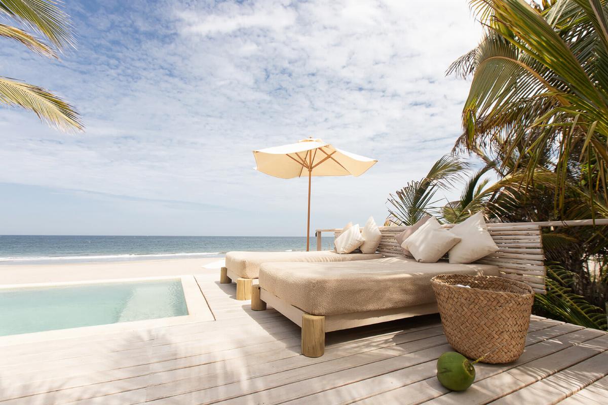 The property features two elegant bedrooms, each with two double beds that can be arranged as one large king-size bed or separated to your preference. An outdoor lounge with a queen-size canopy bed invites you to enjoy fresh and romantic nights. The outdoor areas are designed for relaxation: a pool deck with sunbeds and loungers, and on the beach, two large umbrellas with poufs to take in the endless ocean views.