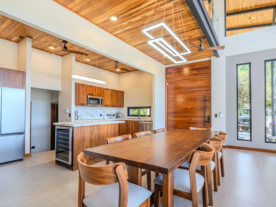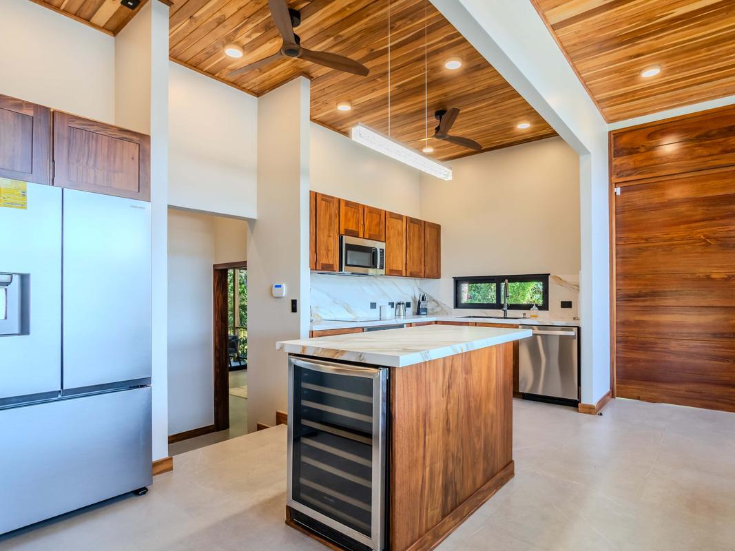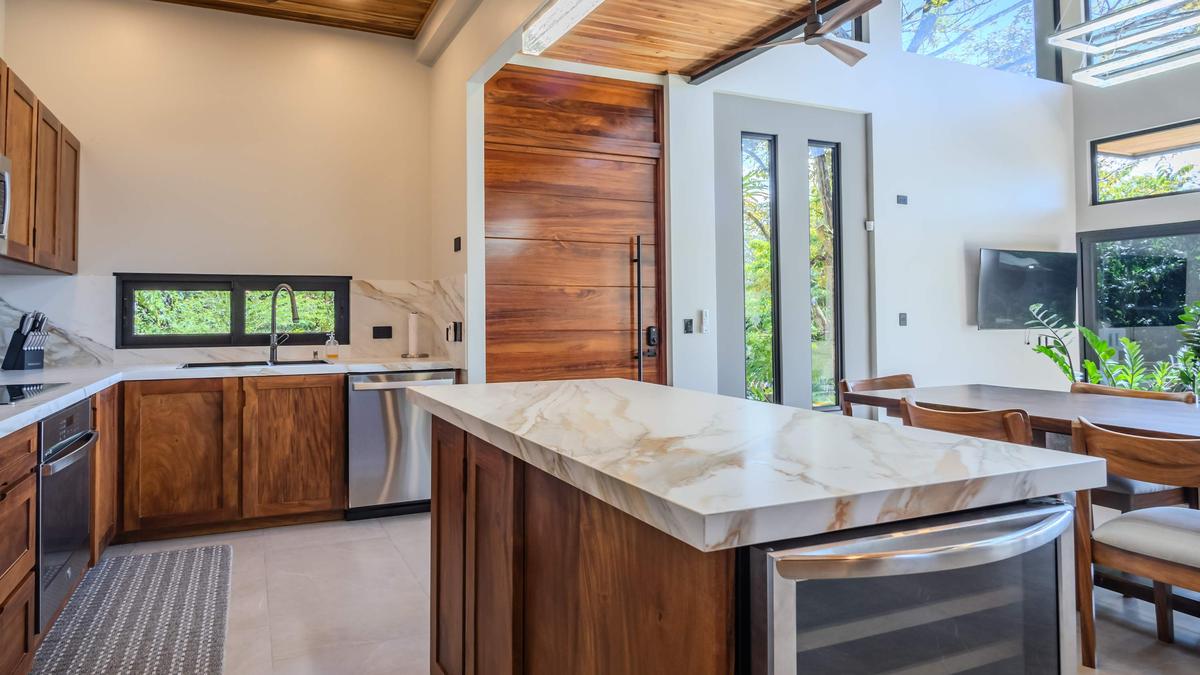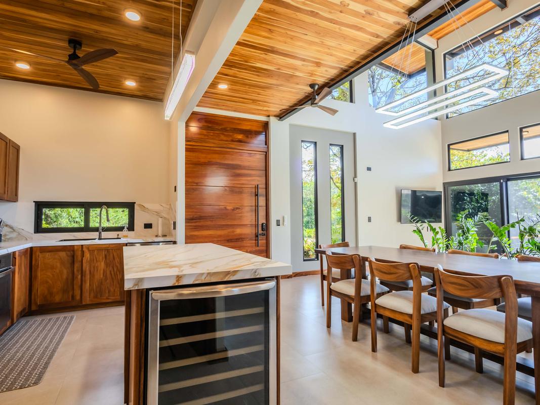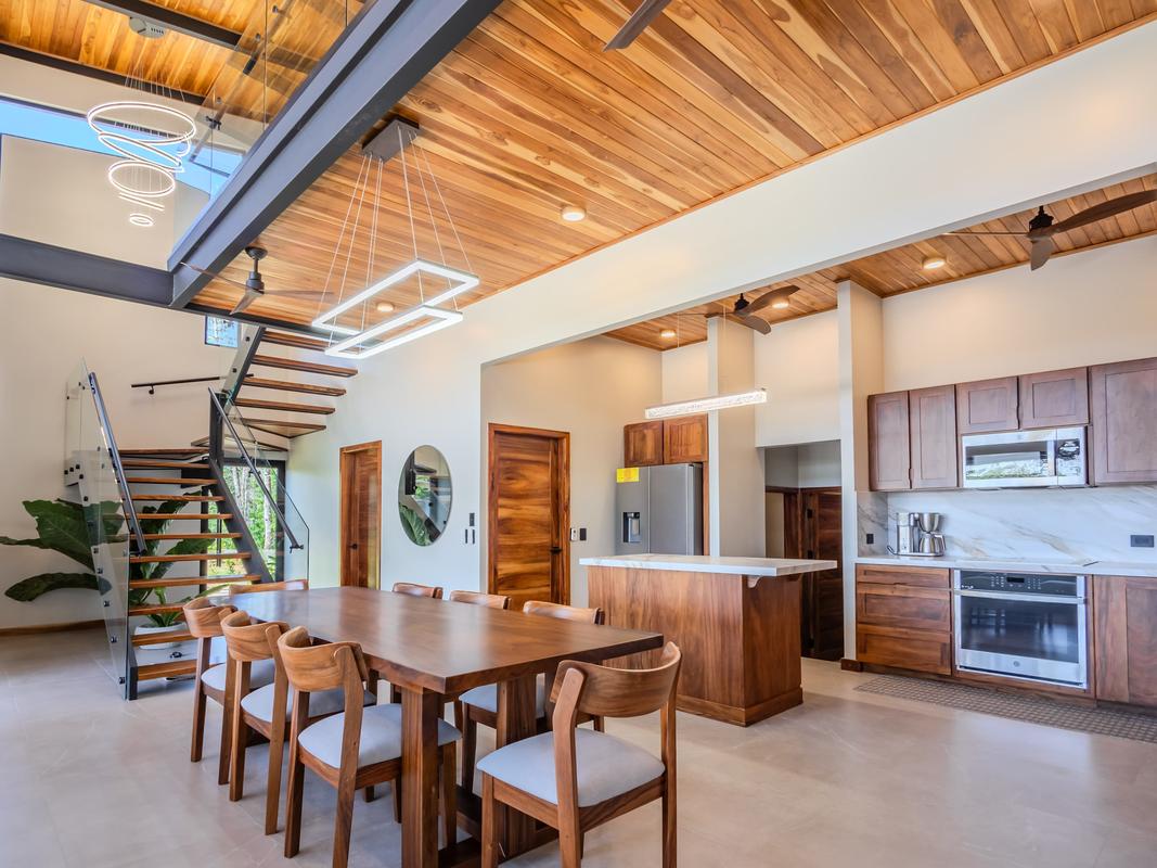 The house features three spacious bedrooms, each equipped with comfortable beds (one king and two queen), en-suite bathrooms, walk-in closets, and views of the lush tropical surroundings. The common areas stand out with their high ceilings and large windows that flood the space with natural light, creating a warm and sophisticated ambiance. The kitchen is fully equipped with modern appliances and all necessary utensils — perfect for preparing anything from casual breakfasts to special dinners.