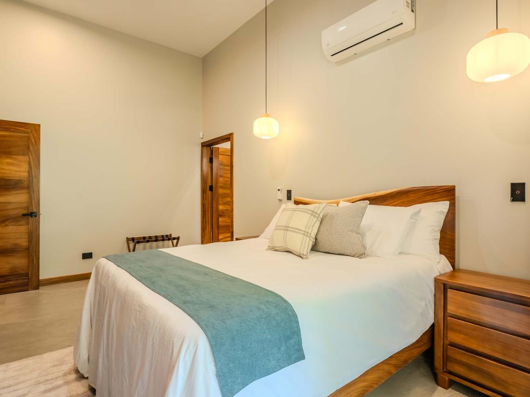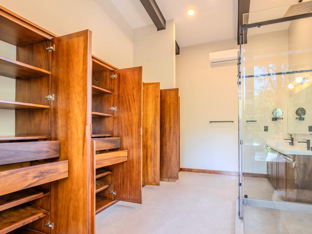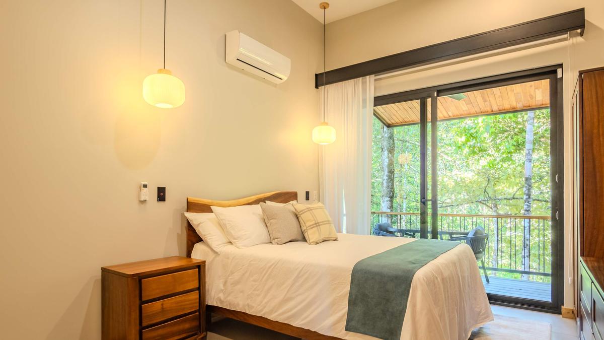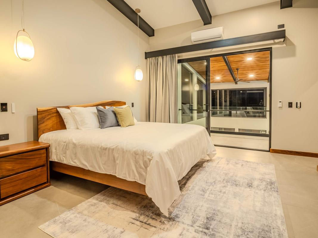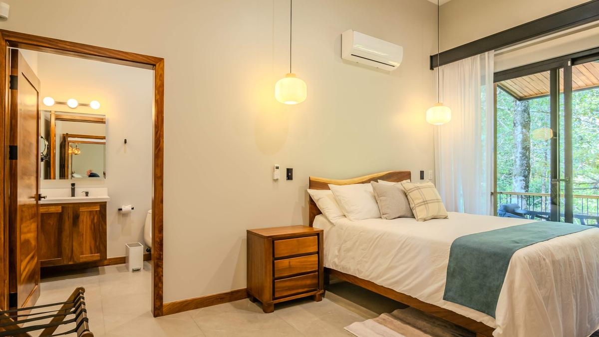 The house features three spacious bedrooms, each equipped with comfortable beds (one king and two queen), en-suite bathrooms, walk-in closets, and views of the lush tropical surroundings. The common areas stand out with their high ceilings and large windows that flood the space with natural light, creating a warm and sophisticated ambiance. The kitchen is fully equipped with modern appliances and all necessary utensils — perfect for preparing anything from casual breakfasts to special dinners.