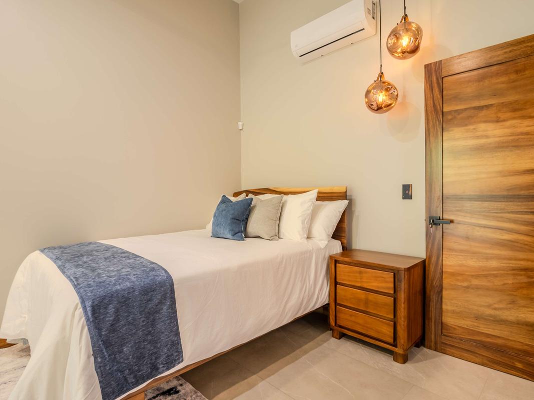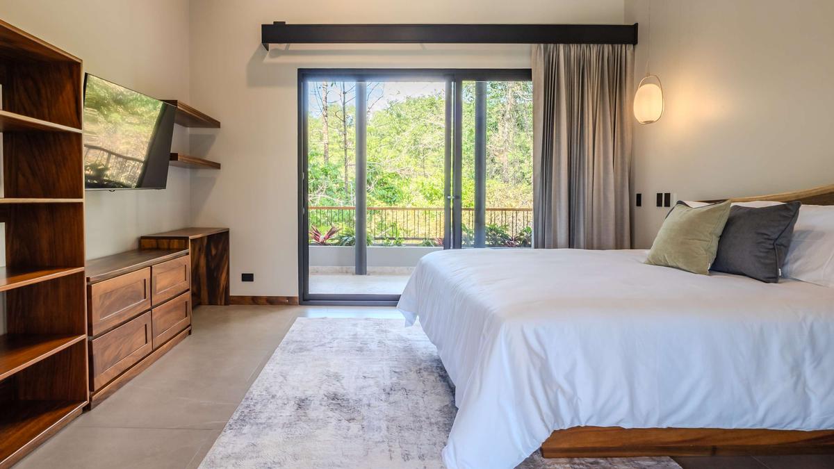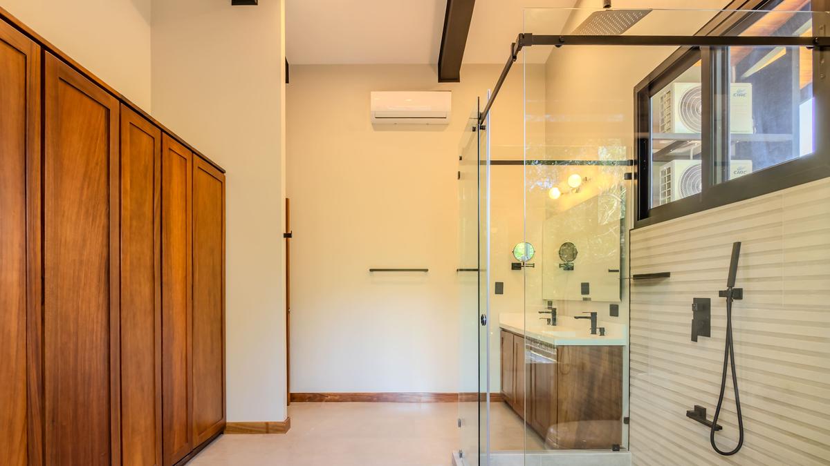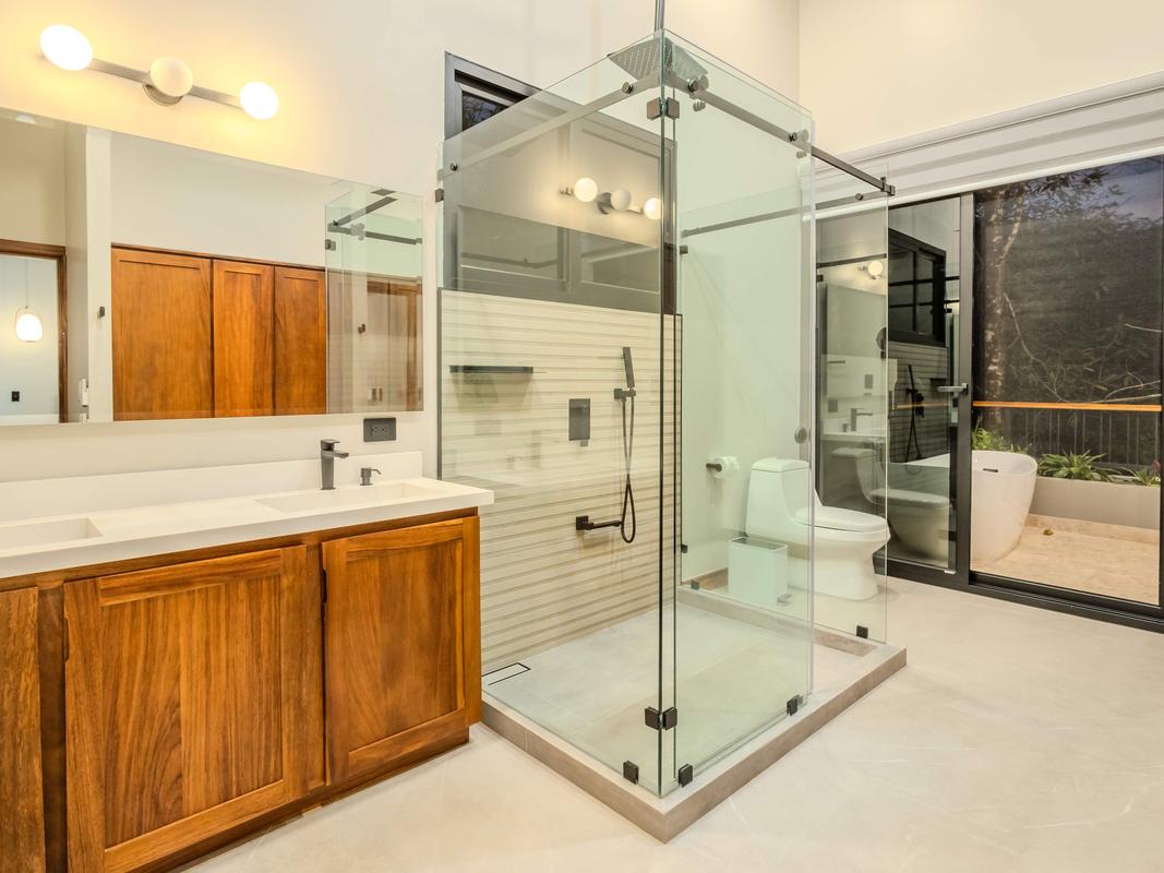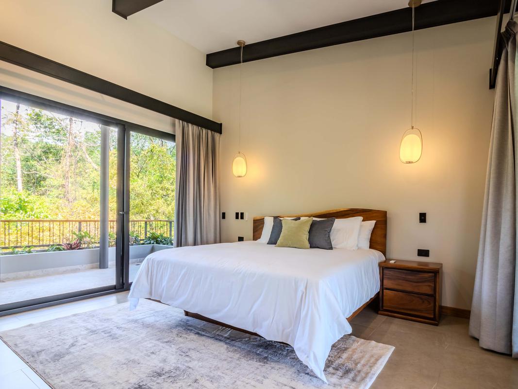 The house features three spacious bedrooms, each equipped with comfortable beds (one king and two queen), en-suite bathrooms, walk-in closets, and views of the lush tropical surroundings. The common areas stand out with their high ceilings and large windows that flood the space with natural light, creating a warm and sophisticated ambiance. The kitchen is fully equipped with modern appliances and all necessary utensils — perfect for preparing anything from casual breakfasts to special dinners.