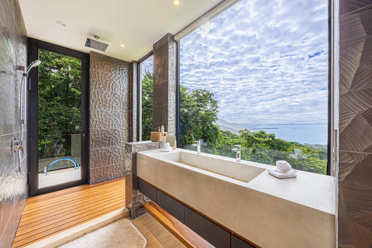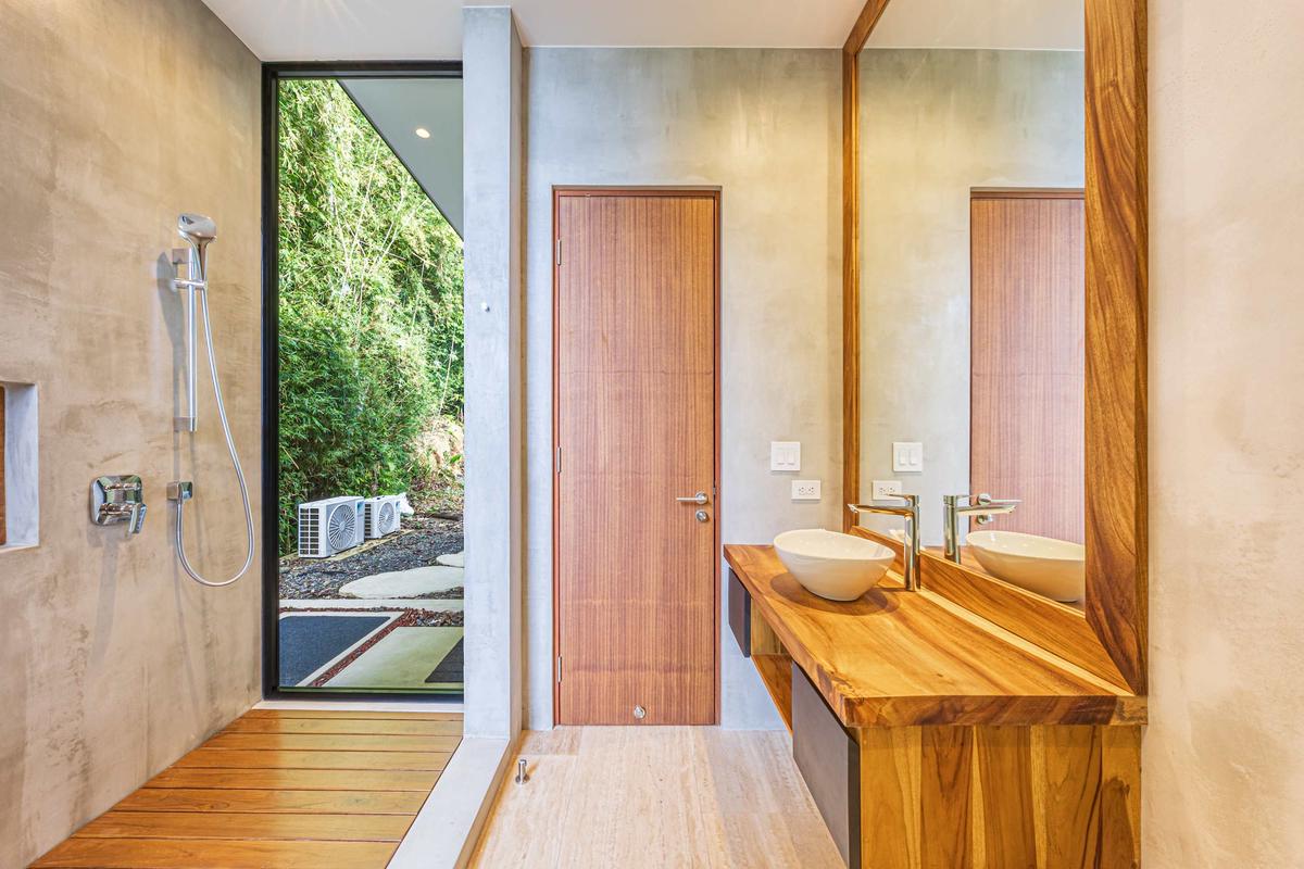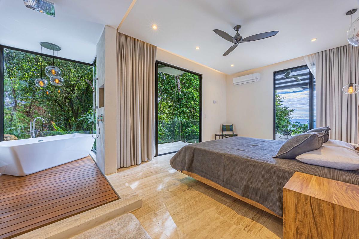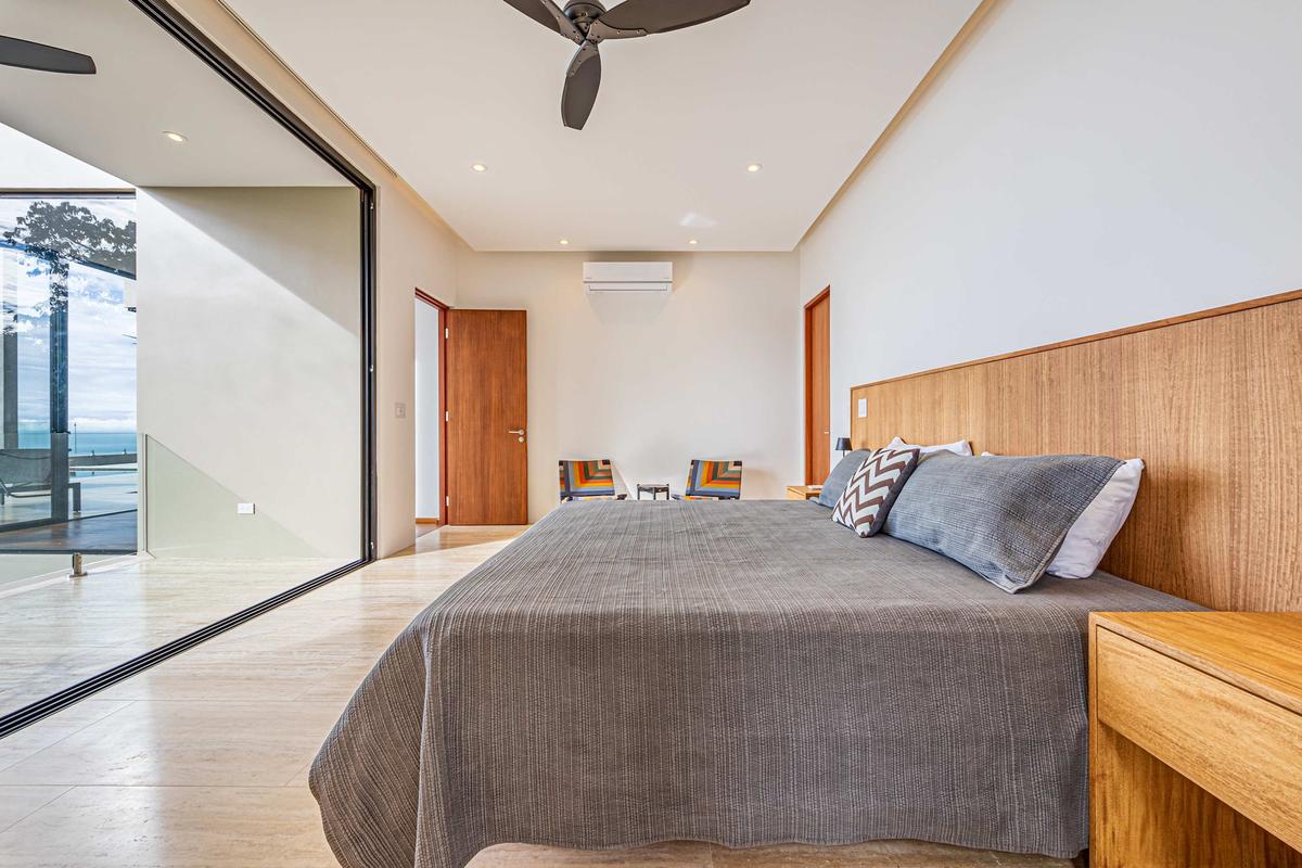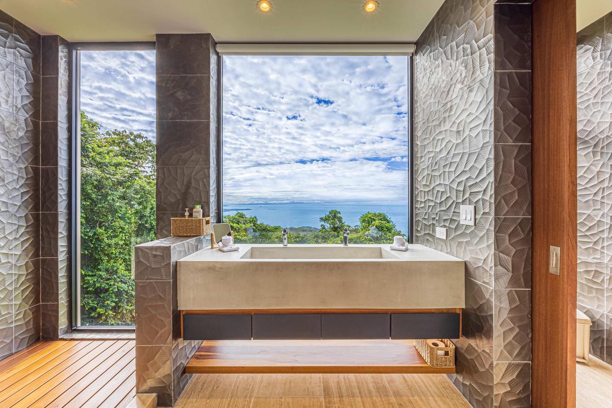 The home features four spacious bedrooms, each with its own private bathroom. Three are located in the main house, while the fourth has a separate entrance—perfect for guests seeking extra privacy or a quiet workspace. Each room offers a unique experience: one with a glass shower facing the ocean, another with a spa-style bathtub and indoor shower, and one with an outdoor soaking tub overlooking the sea. Three bedrooms are furnished with king-size beds (one of which can be converted into two twins), and the fourth has a queen-size bed.