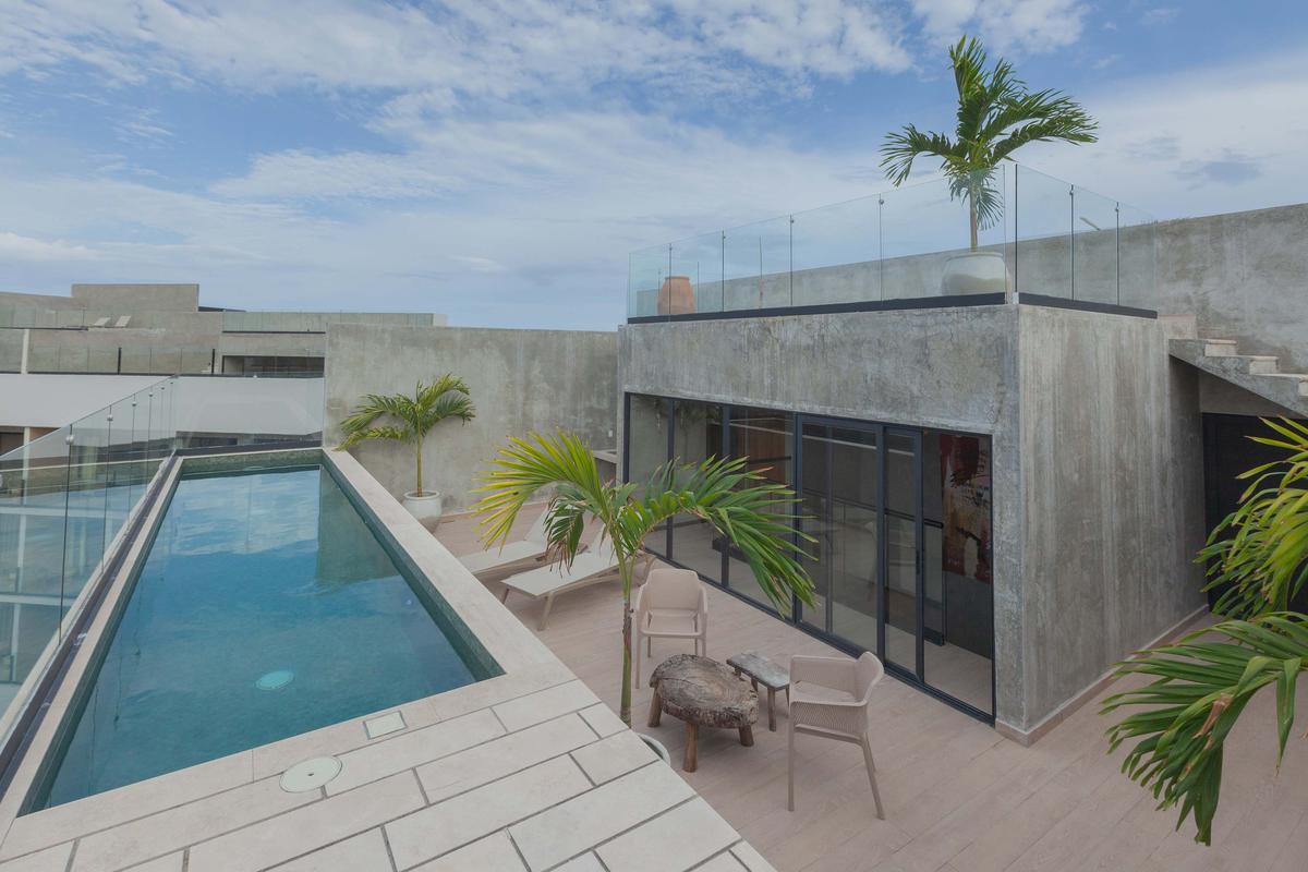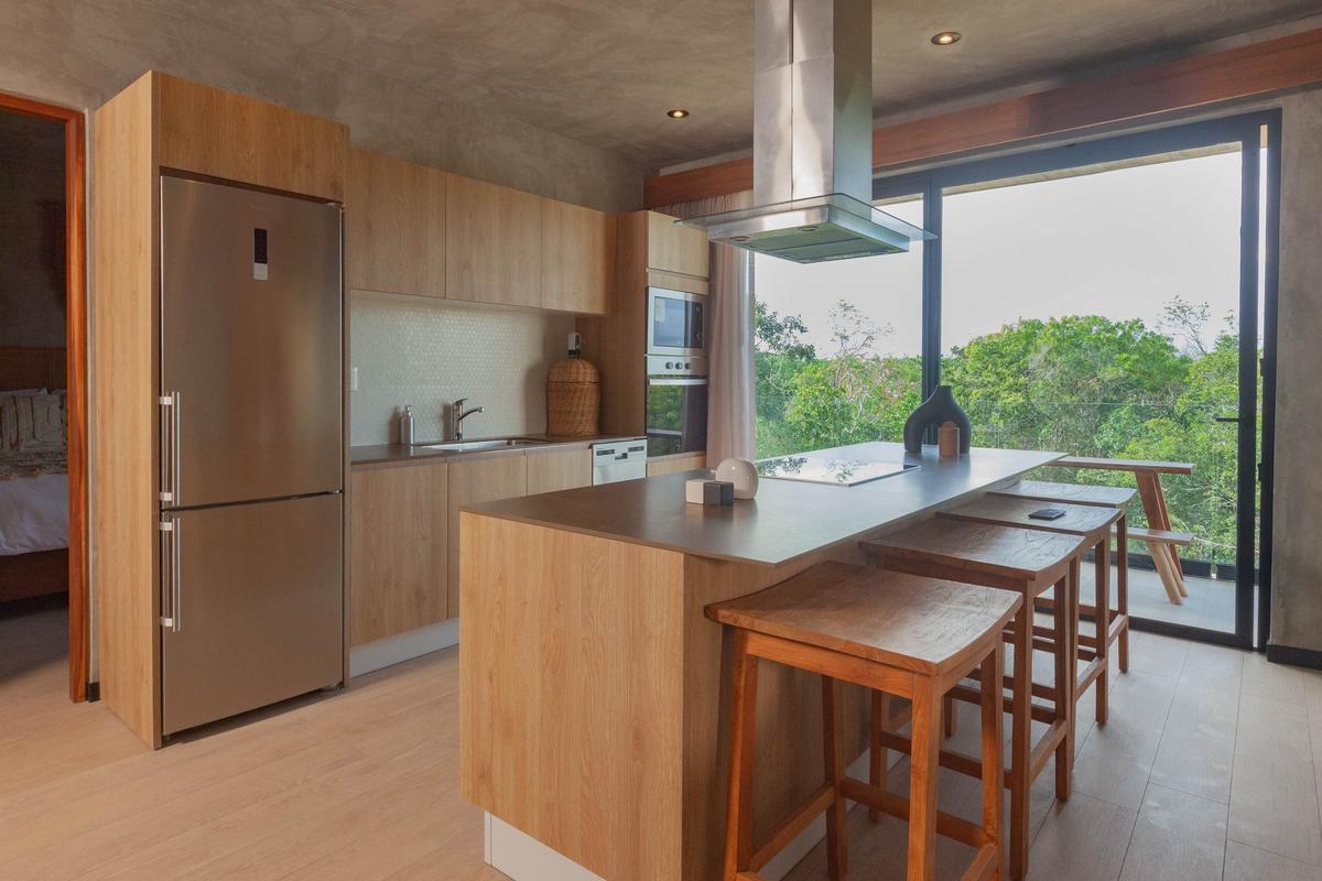 Heading upstairs, your private rooftop awaits, featuring an exclusive pool and spectacular views of the Tulum jungle. The penthouse is equipped with central air conditioning, ceiling fans in the bedrooms, coffee, tea, towels, complimentary water upon arrival, toiletries, and everything you may need in the kitchen—from utensils to pots and pans.