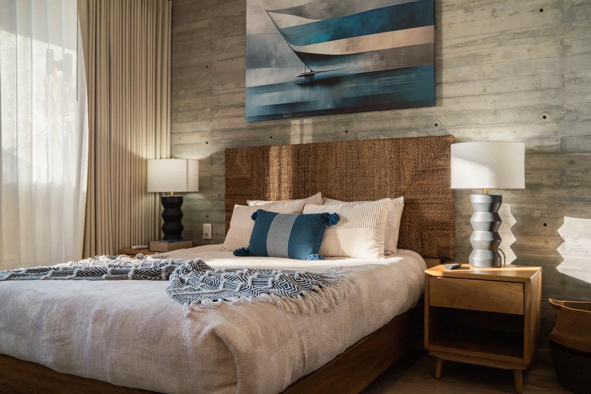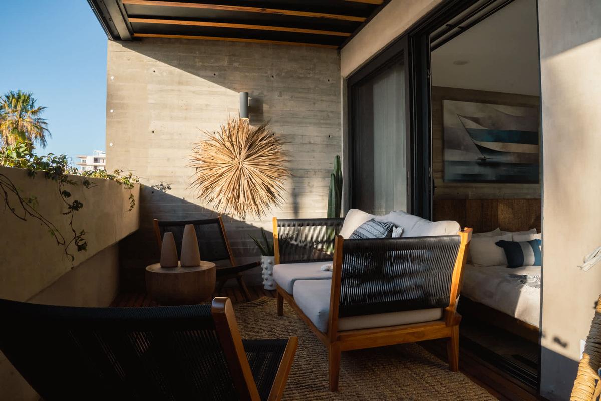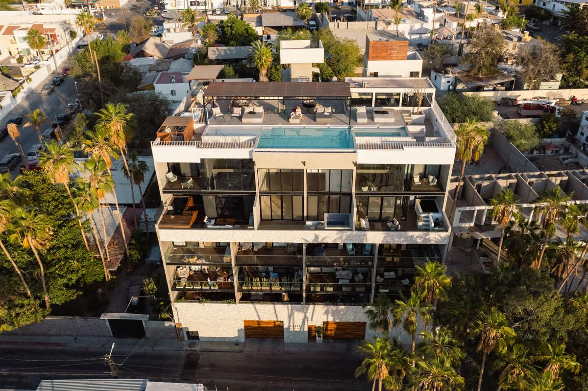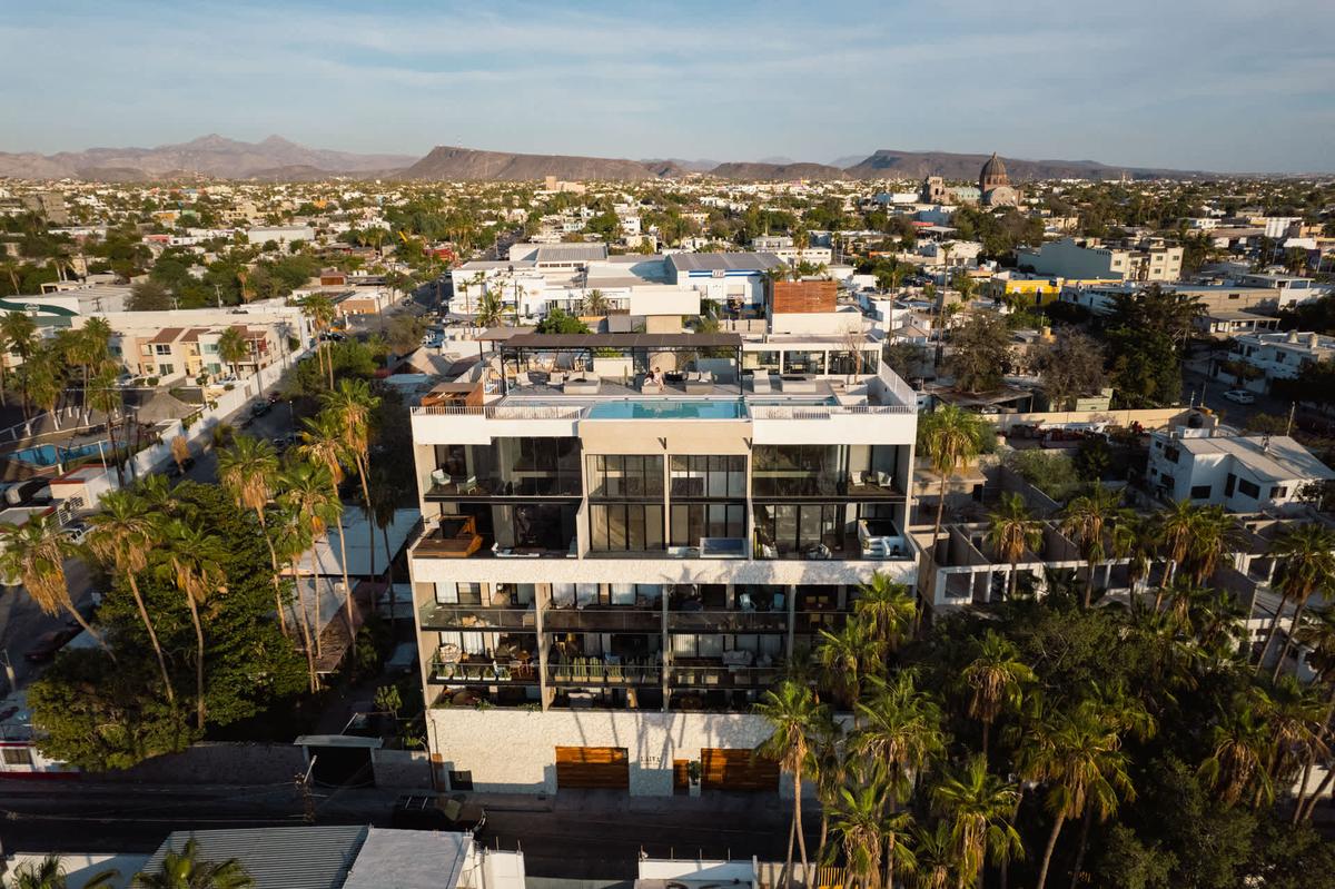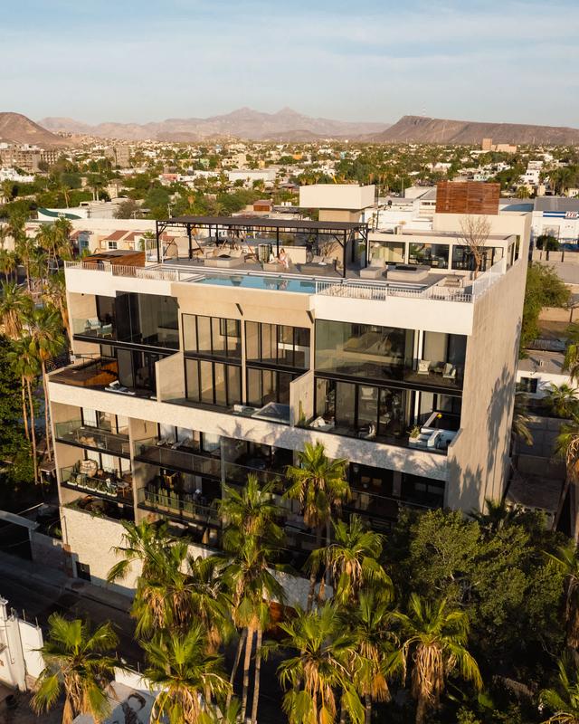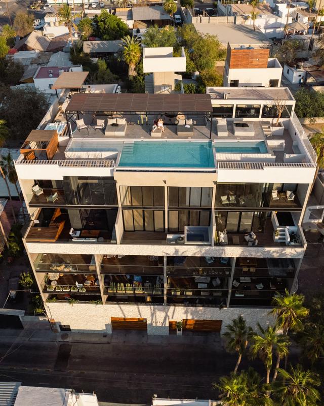 The building’s shared amenities include a rooftop with a pool offering spectacular views of the bay and the city of La Paz. There is also a smaller pool, a fully equipped gym, a pergola with a grill, and a relaxing lounge area with light wooden structures and flowing fabrics. The rooftop also features a scenic lookout at the highest point and full restrooms for both men and women.