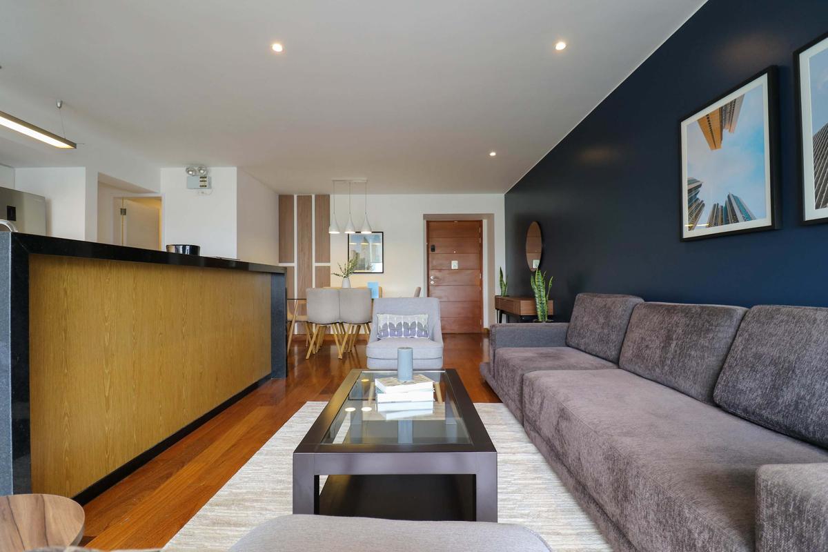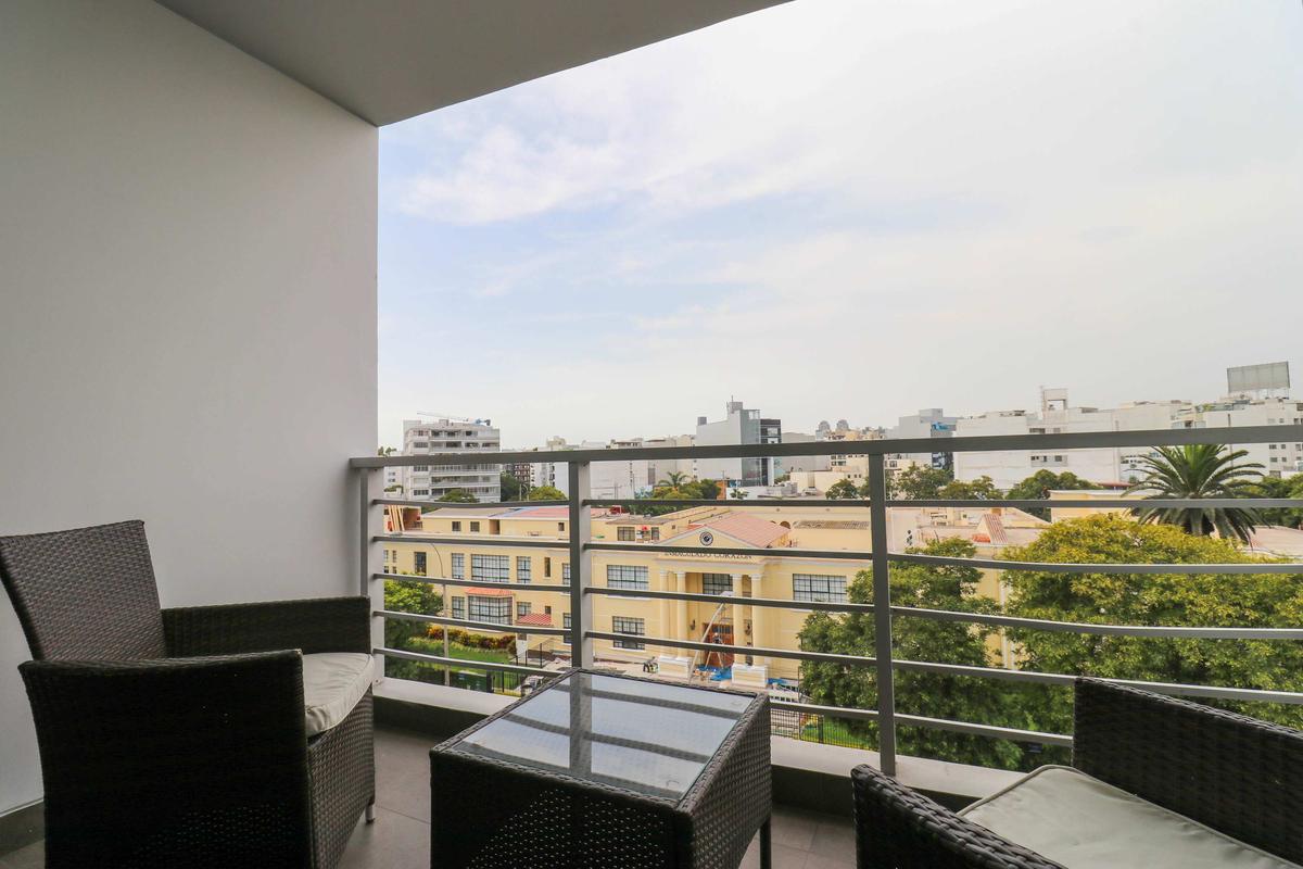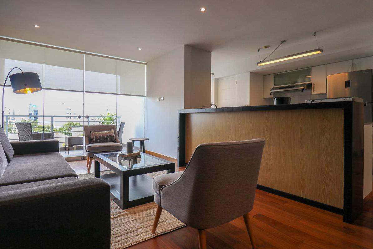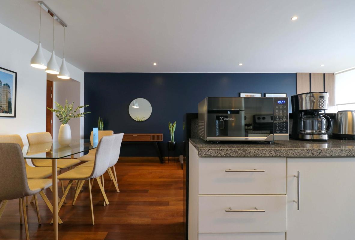 In the welcoming Miraflores neighborhood, this beautiful apartment it's very well located; just minutes away from Larcomar shopping center, Parque Kennedy, Virgen de Fatima Parish, and exclusive gyms. The area has currency exchange services, and labs centers in case you need to take a test, such as ROE and Multilab.